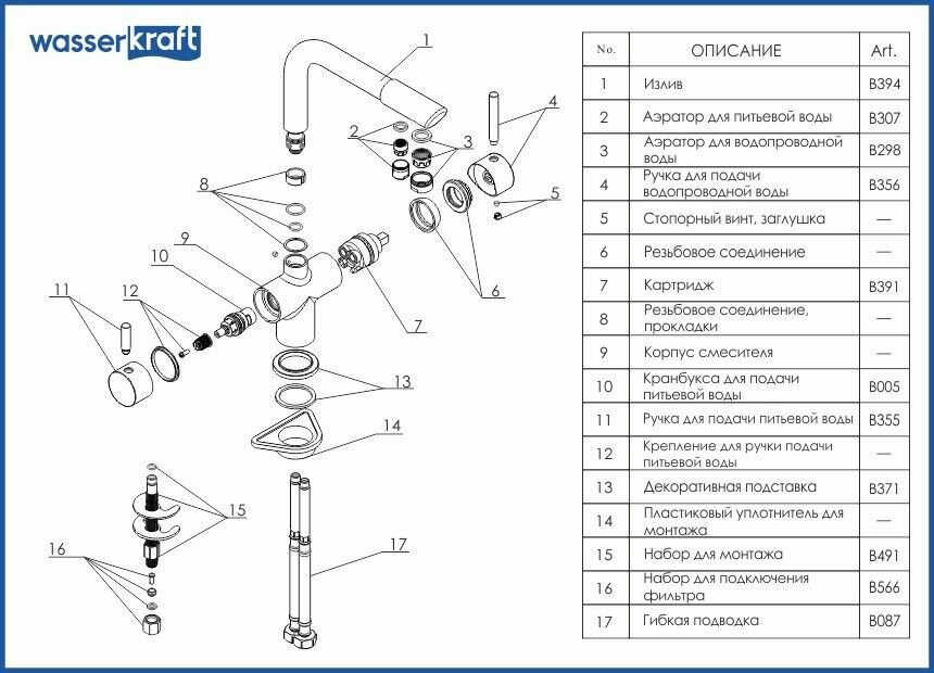 Смеситель для кухни WasserKRAFT A8317. Керамический картридж 35мм, Sedal. Керамический картридж 25мм, Hent. Встроенный силиконовый аэратор для равномерного распределения струи. Встроенный пластиковый аэратор, для равномерного распределения струи. Поворотный излив. Подключение к любому стандартному фильтру. Входит в комплект: гибкая подводка G1/2, 430мм, набор для монтажа, пластиковый уплотнитель для монтажа