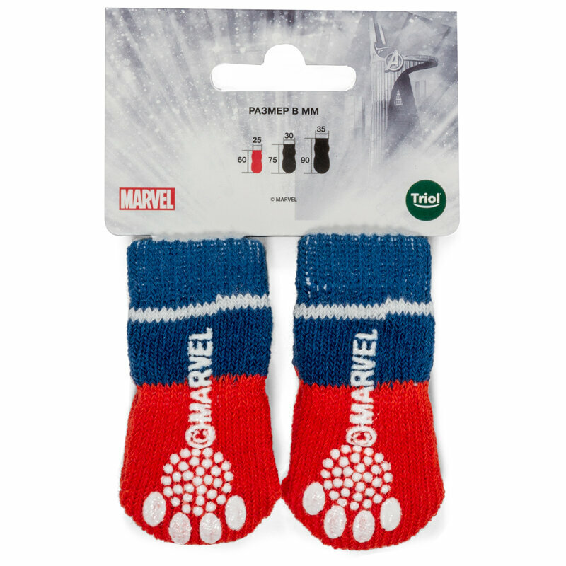 Яркие носочки с изображением логотипа Капитана Америки - не только стильный, но и полезный аксессуар для вашего питомца. Такие носочки ограждают интерьер от когтей любимца и, благодаря противоскользящему покрытию, позволяют четвероногому питомцу с комфортом передвигаться по паркету, кафелю и другим скользким покрытиям.