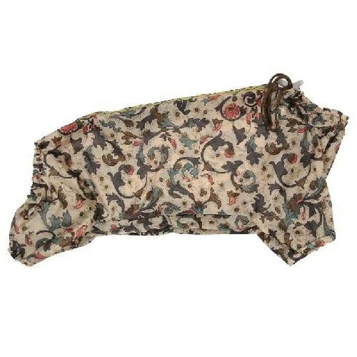 Комбинезон удобно садится по фигуре питомца и не стесняет его движений при прогулке. Изделие надежно фиксируется при помощи липучки на спине, ширина горловины регулируется при помощи завязки, а на штанинах предусмотрены удобные резинки, препятствующие попаданию грязи и влаги снизу.