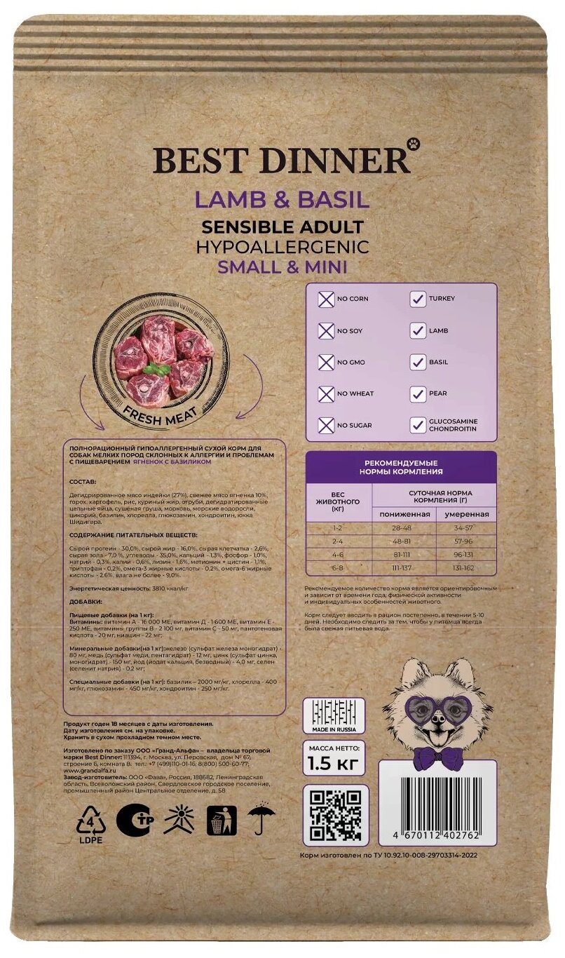 BEST DINNER Holistic Sensible Hypo Adult Small&Mini Корм сух.ягн./базилик д/соб.мелк.пор.10кг (78110)