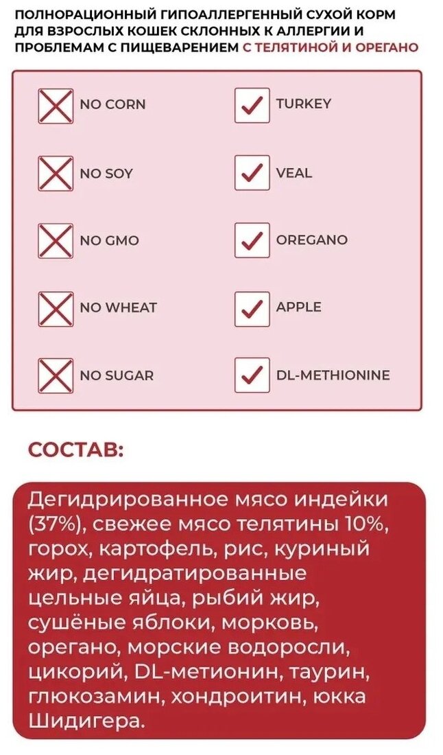 Телятина и орегано: Дегидрированное мясо индейки (37%), свежее мясо телятины 10%, горох, картофель, рис, куриный жир, дегидратированные цельные яйца, рыбий жир, сушёные яблоки, морковь, орегано, морские водоросли, цикорий, DL-метиононин, таурин, глюкозамин, хондроитин, юкка Шидигера.