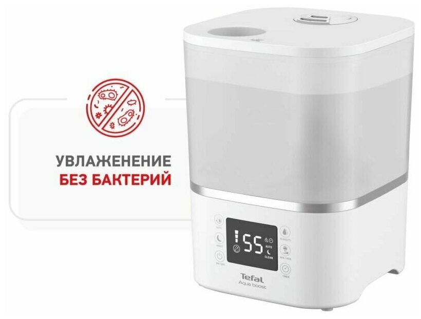 Напольный воздухоувлажнитель Tefal подходит для помещений площадью до 50 кв. м. Корпус из прочного пластика — устойчив к деформациям. Удобная настройка трех режимов работы — автоматического, ночного и ручного. Легкое обслуживание — можно наполнить через специальный отсек сверху. Ультразвуковой тип увлажнения, теплый пар — для очистки комнаты от бактерий и вирусов. Объем резервуара — 2,5 л, максимальная производительность — 380 мл/ч. Установлены гигрометр и гигростат — для определения уровня влажности и поддержки оптимальных показателей. Выключается при отсутствии воды. Уровень шума 30 дБ — тихая работа в ночное и дневное время. Можно установить таймер и подсветку дисплея. Время непрерывной работы — до 12 часов.