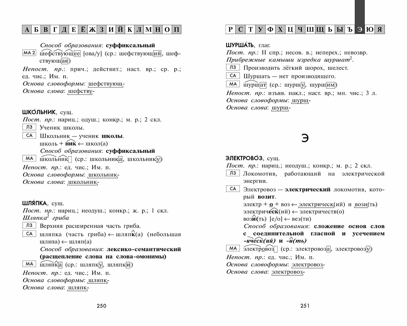 Словарь включает около 600 слов. Они были взяты из упражнений учебников, входящих в федеральный перечень. Впервые для каждого слова проводится морфемный и словообразовательный анализ, что помогает учащимся разобраться в этих сложных темах. Также к каждому слову дано лексическое значение и морфологическая характеристика.