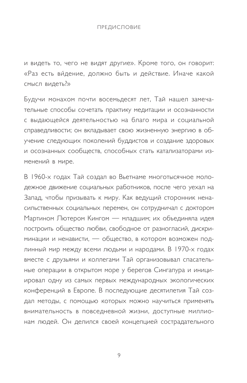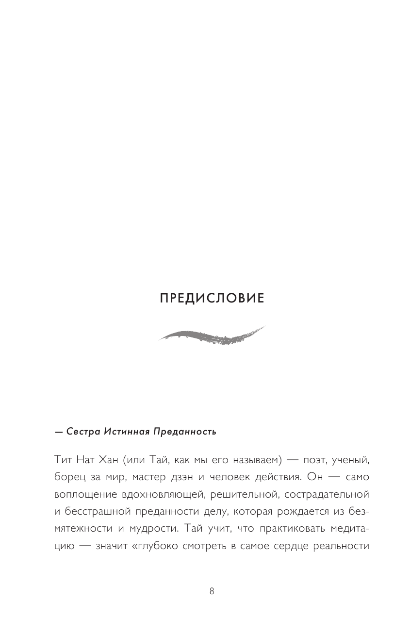 "Тай (Тит Нат Хан) учит, что практиковать медитацию значит "глубоко смотреть в самое сердце реальности и видеть то, чего не видят другие". В этой книге собраны поучения разных лет. Тай представляет практичную повседневную этику, призванную направлять наши решения и поступки, преобразовывать привычки и помогать ощущать радость и смысл в каждом моменте. Тай объясняет, что без такой этики - без духовного измерения, направляющего нашу повседневную жизнь, - мы потеряем всё". - Сестра Истинная Преданность, ученица Тит Нат Хана и соавтор книги "Дзен и искусство спасения планеты"
