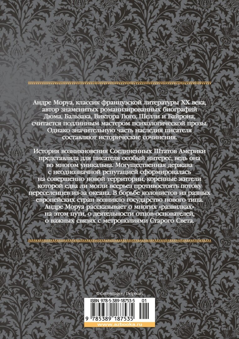 История возникновения Соединенных Штатов Америки представляла для писателя особый интерес, ведь она во многом уникальна. Могущественная держава с неоднозначной репутацией сформировалась на совершенно новой территории, коренные жители которой едва ли могли противостоять новым поселенцам. В борьбе колонистов из разных европейских стран возникло государство нового типа. Андре Моруа рассказывает о многих "развилках" на этом пути, о деятельности отцов-основателей, о важных связях с метрополиями Старого Света.