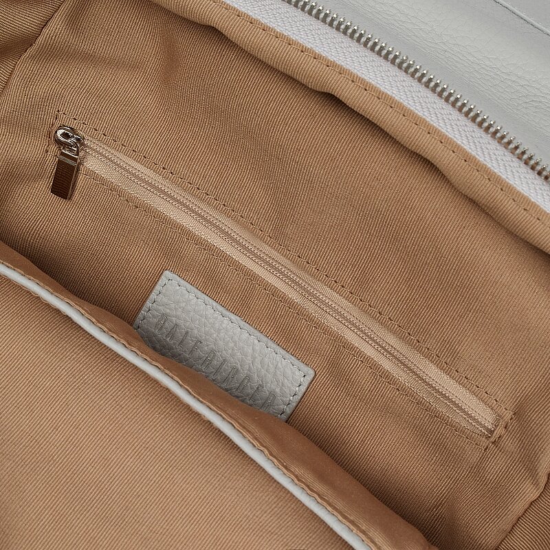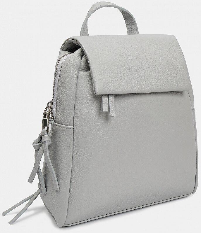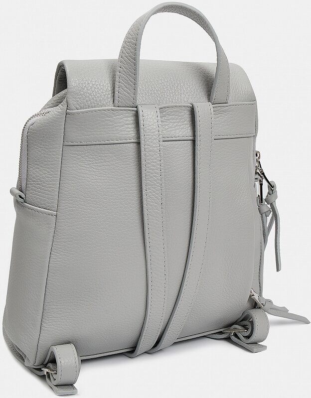 Рюкзак женский мягкой трапециевидной формы из натуральной кожи с зернистой фактурой. Основное отделение закрывается на молнию и крышку-клапан. Внутри и снаружи есть закрытые карманы для документов и карт. Длинные пуллеры на молниях удобно держать в руках, рюкзак легко открывать в дороге. Носить удобно в руках, на плече или за спиной на двух лямках. Рюкзак серый минималистичной формы дополнит повседневные образы в стиле casual.
