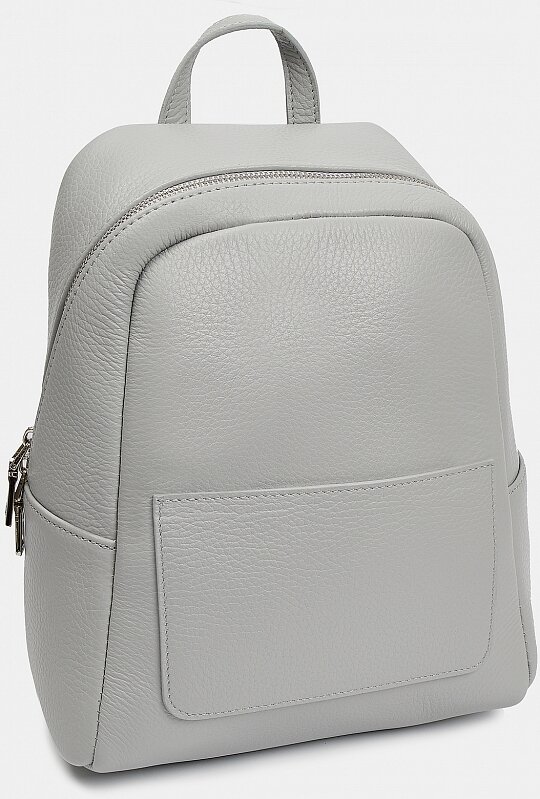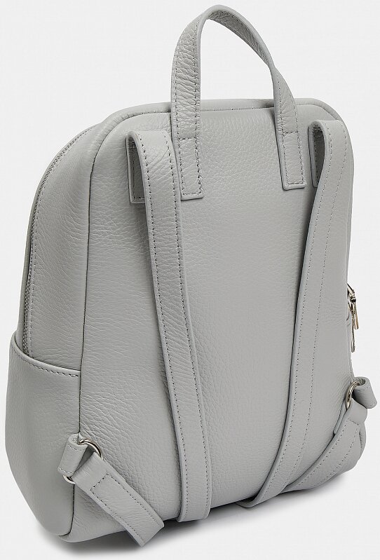 Рюкзак женский в форме трапеции из натуральной кожи с зернистой фактурой. Основное отделение застегивается на молнию, внутри есть закрытый карман, снаружи — три открытых для мелочей. Носить удобно в руках, на плече или за спиной на двух лямках. Рюкзак серый минималистичной формы дополнит нестрогие деловые и повседневные образы в стиле casual.