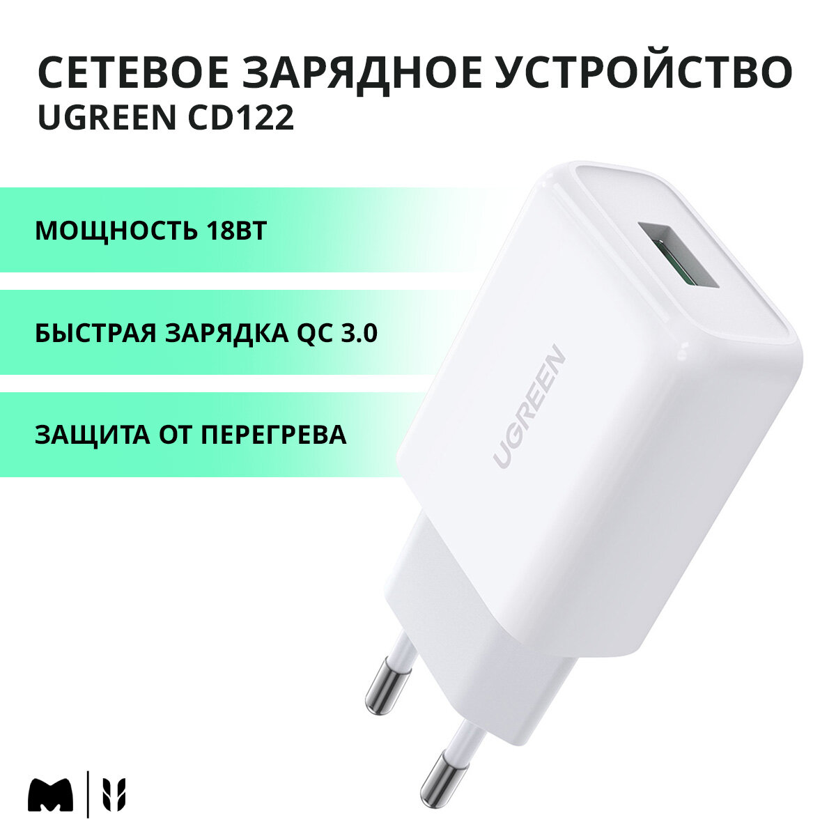 Сетевое зарядное устройство Ugreen выполнено в корпусе черного цвета и отличается компактными размерами. Оно подключается к электрической розетке и благодаря поддержке функции Quick Charger с выходной мощностью до 18 Вт помогает быстро восстанавливать заряд аккумулятора, в котором реализована поддержка данного стандарта. Также Ugreen подходит для устройств без поддержки ускоренной зарядки. Блок оснащен одним портом USB-A, к которому можно подключать кабели разной портативной техники. Зарядное устройство поставляется без кабеля.