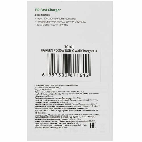 | Наименование модели | CD127 (70161) PD 30W USB-C Wall Charger EU - White |