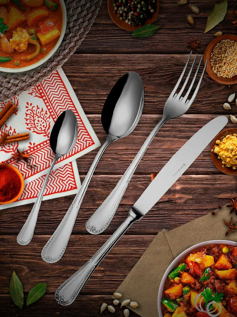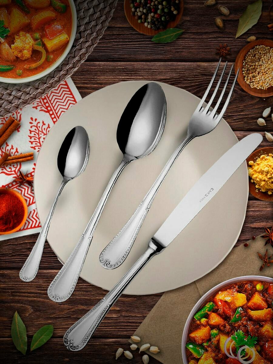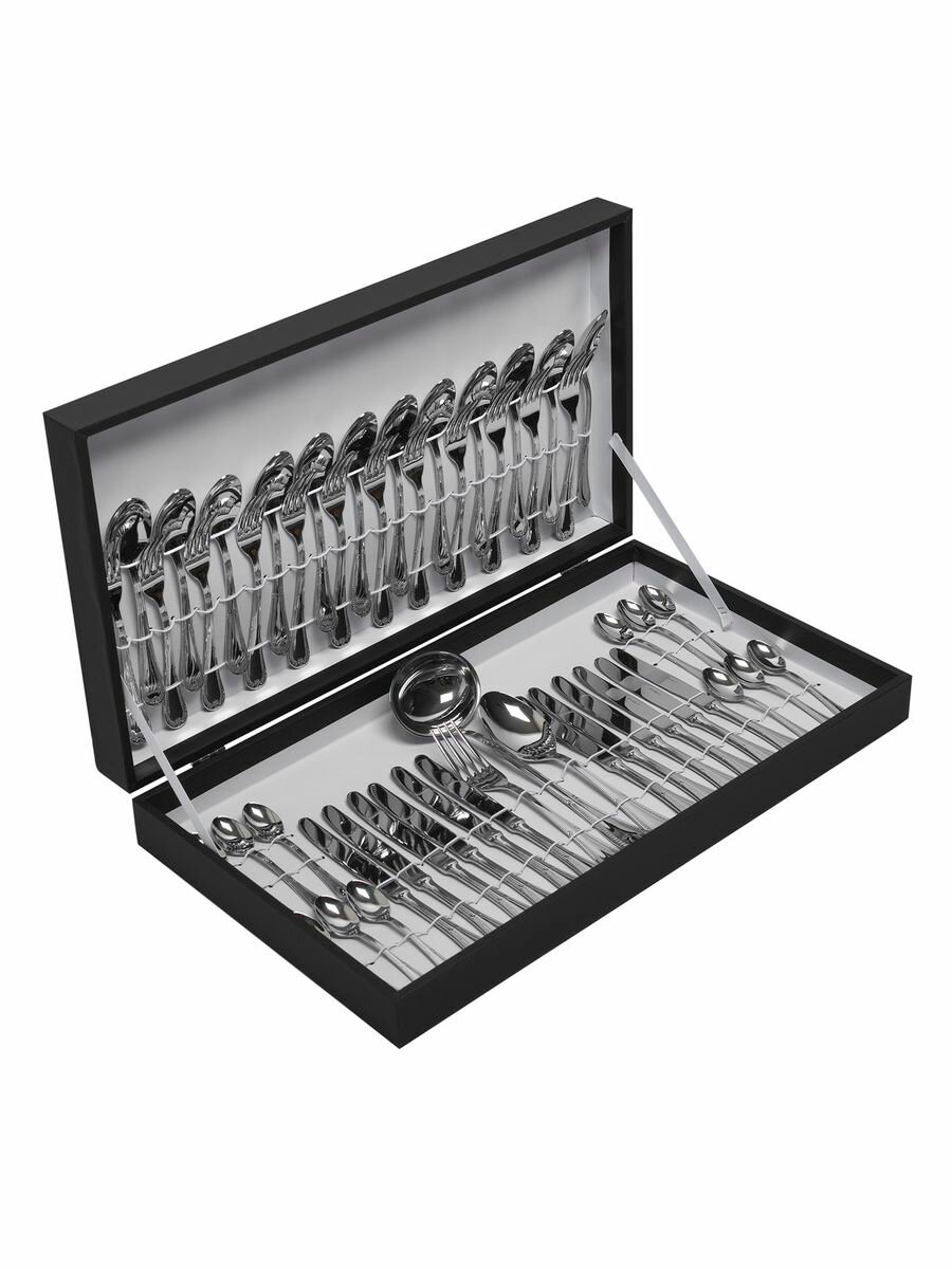Набор столовых приборов 51 предмет от легендарного бренда EME. Состав набора :12 столовых ложек, 12 вилок, 12 столовых ножей, 12 ложек для кофе, 1 половник, 1 сервировочную вилку с четырьмя зубцами и сервировочную ложку. Все приборы изготовлены из нержавеющей стали 18/10 с глянцевой поверхностью. Набор столовых предметов выполнен из высококачественной нержавеющей стали от легендарного бренда EME , очень прочные, не гнутся, имеют длительный срок службы, отлично сохраняют эксплуатационные свойства. Пищевая нержавеющая сталь не имеет запаха и сохраняет вкус и аромат продуктов натуральными. Приборы для кухни с выпуклостью в симметричном формате и тщательно закругленными краями, обеспечивающими больший комфорт в использовании. Утонченные, привлекательные изогнутые линии приборов объединяют в себе отличную эргономику и изысканный внешний вид. Дизайн воссоздан по всем канонам стиля, не подвластному времени и моде. Набор посуды столовой подойдет на праздник и на каждый день для сервировки стола. Их можно мыть ежедневно в посудомоечной машине. Приборы столовые вилки ложки в комплекте в индивидуальном подарочном чемоданчике.