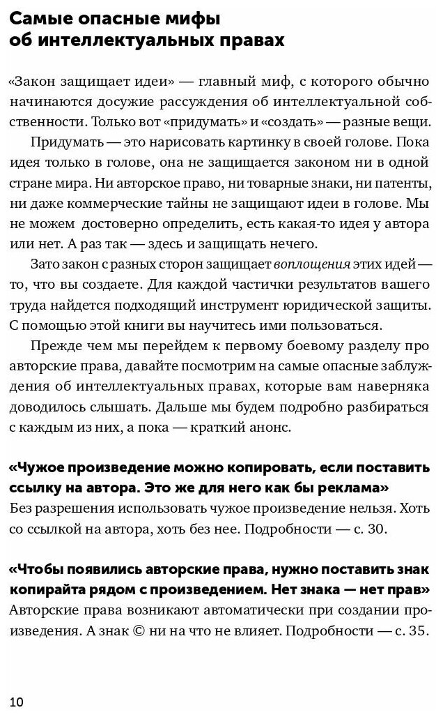 Приятно удивлена содержанием книги, думала что она из серии \"прокачки личного бренда автора\" но она максимально полезная, от этого кстати к автору лояльность выше. Понятным языком о важном. Есть ссылки на статьи закона, все структурированно и читабельно. Бонусом, стиль изложения наталкивает на поток интересных параллельных мыслей. Видела в отзывах о том что книга полезна юристам и студентам юр.фака, хочу дополнить что она полезна куда более широкому кругу лиц, например всем кто что либо создаёт (авторы песен, статей, музыки, фотографы, дизайнеры и многие другие), для тех кто в найме и тех кто работает на себя.