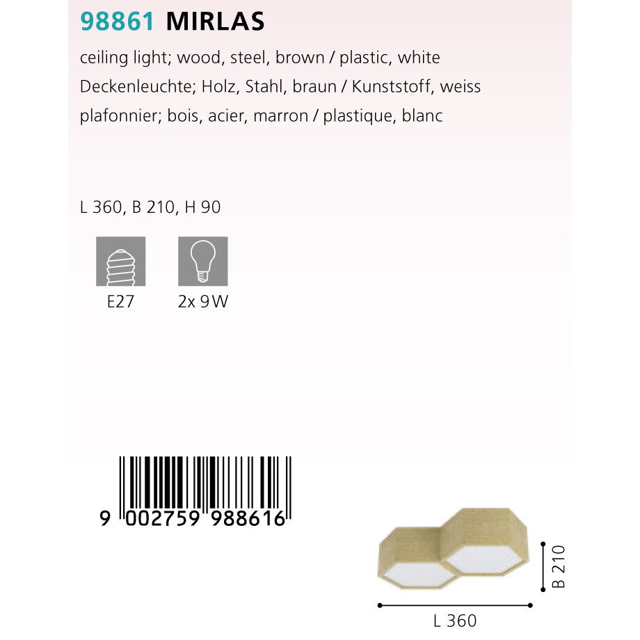 Номенклатура | 98861 Потолочный светильник MIRLAS, 2x9W, E27, L360, B210, H90, дерево, сталь, коричневый/пластик, белый |