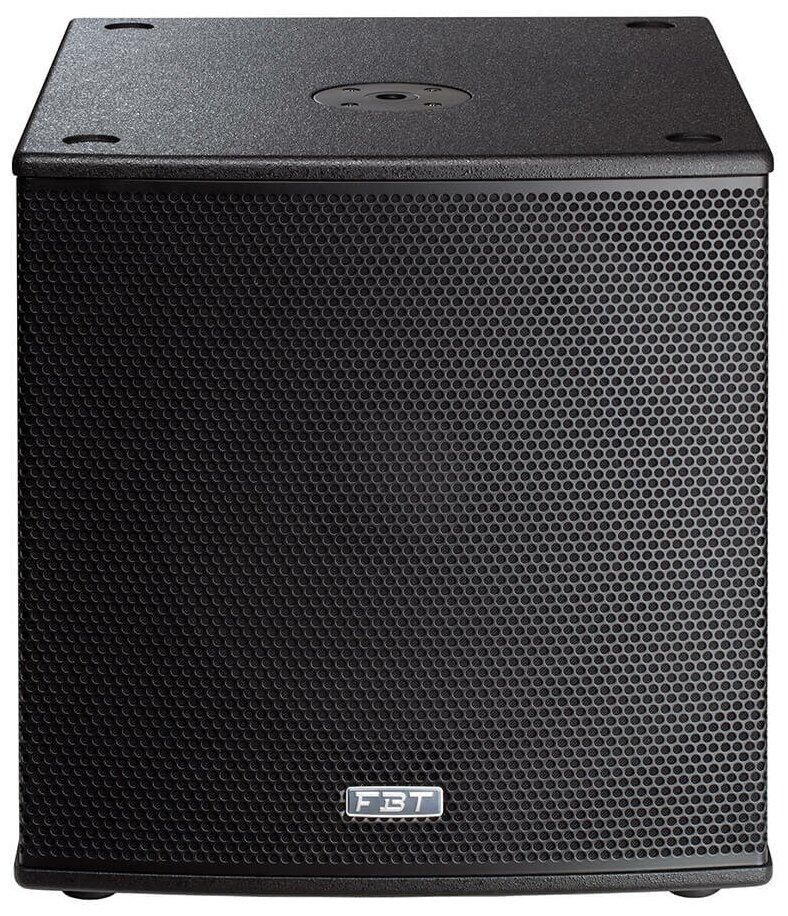 Активный сабвуфер 15 с фазоинвертором и с высоким уровнем звукового давления. 380-миллиметровый (15-дюймовый) низкочастотный динамик с магнитом и 75-миллиметровой (3-дюймовой) звуковой катушкой. Частотная характеристика от 38 Гц до 140 Гц (-6 дБ). Встроенный усилитель, разработанный и изготовленный FBT, имеет мощность 700 Вт RMS LF в классе D. Цифровой сигнальный процессор с 8 предустановками, 2 эквалайзера с 2 настройками кроссовера LPF, кардиоидная конфигурация. Панель управления со стереовходами/выходами XLR, громкостью, предустановками эквалайзера, 8-ступенчатой задержкой от 0,25 до 3,5 м, переключателем реверса фазы 0 – 180°, 3 светодиодными индикаторами состояния. Корпус из березовой фанеры толщиной 15 мм, устойчивый к царапинам, с внутренними распорками. Гнездо M20 (20 мм) для установки сателлита на стойку и две алюминиевые эргономичные ручки FBT. Максимальное звуковое давление (SPL): 132 дБ (продолжительное) и 135 дБ (пиковое). Размеры: 500 x 517 x 570 мм. Вес 28 кг.