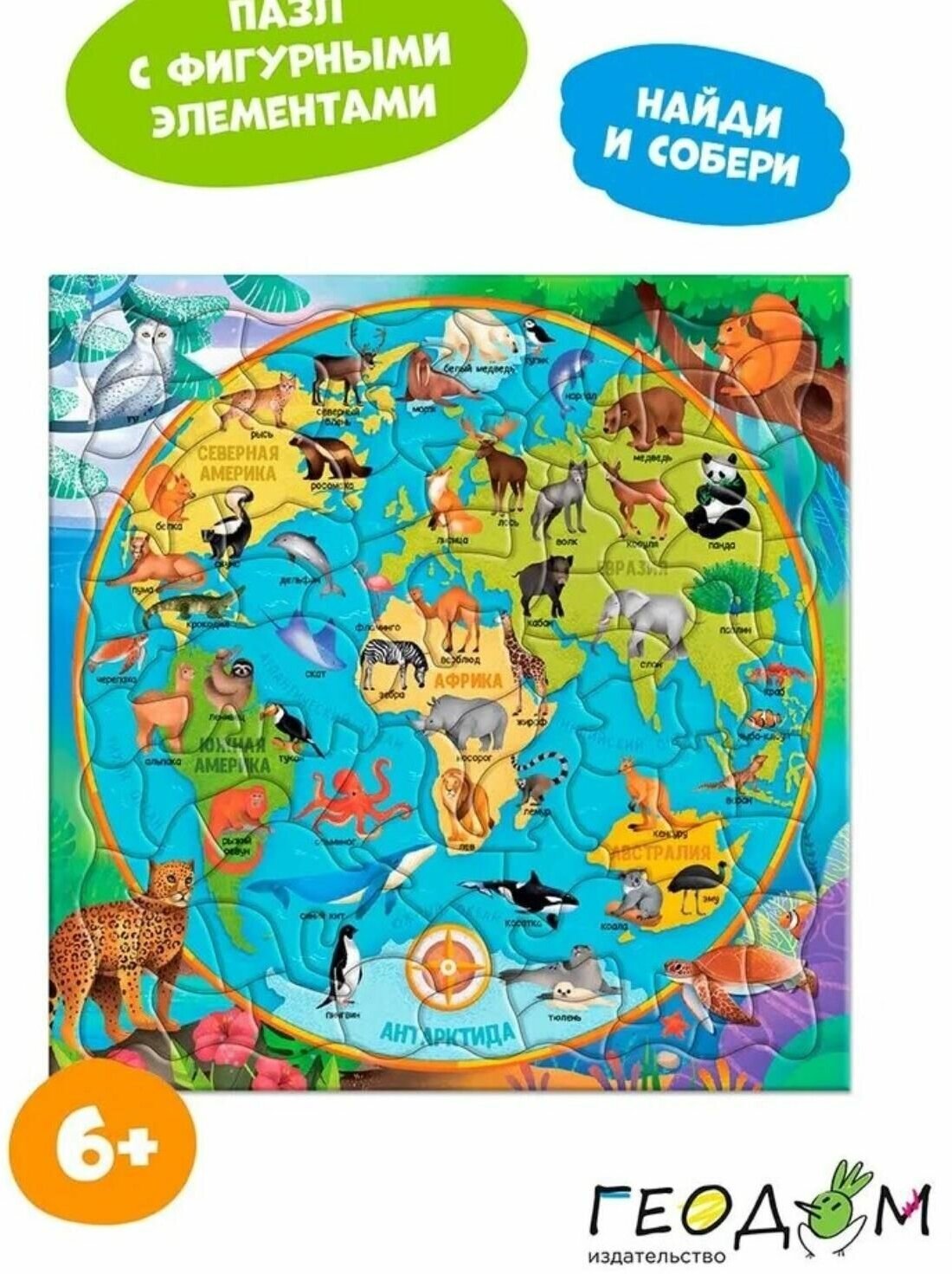 На красочной карте мира - разные континенты и их обитатели. Находите животных среди элементов пазла - собирайте, играйте и рассматривайте!