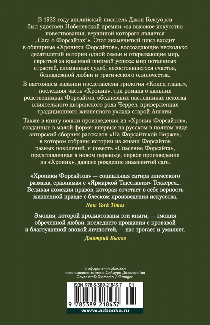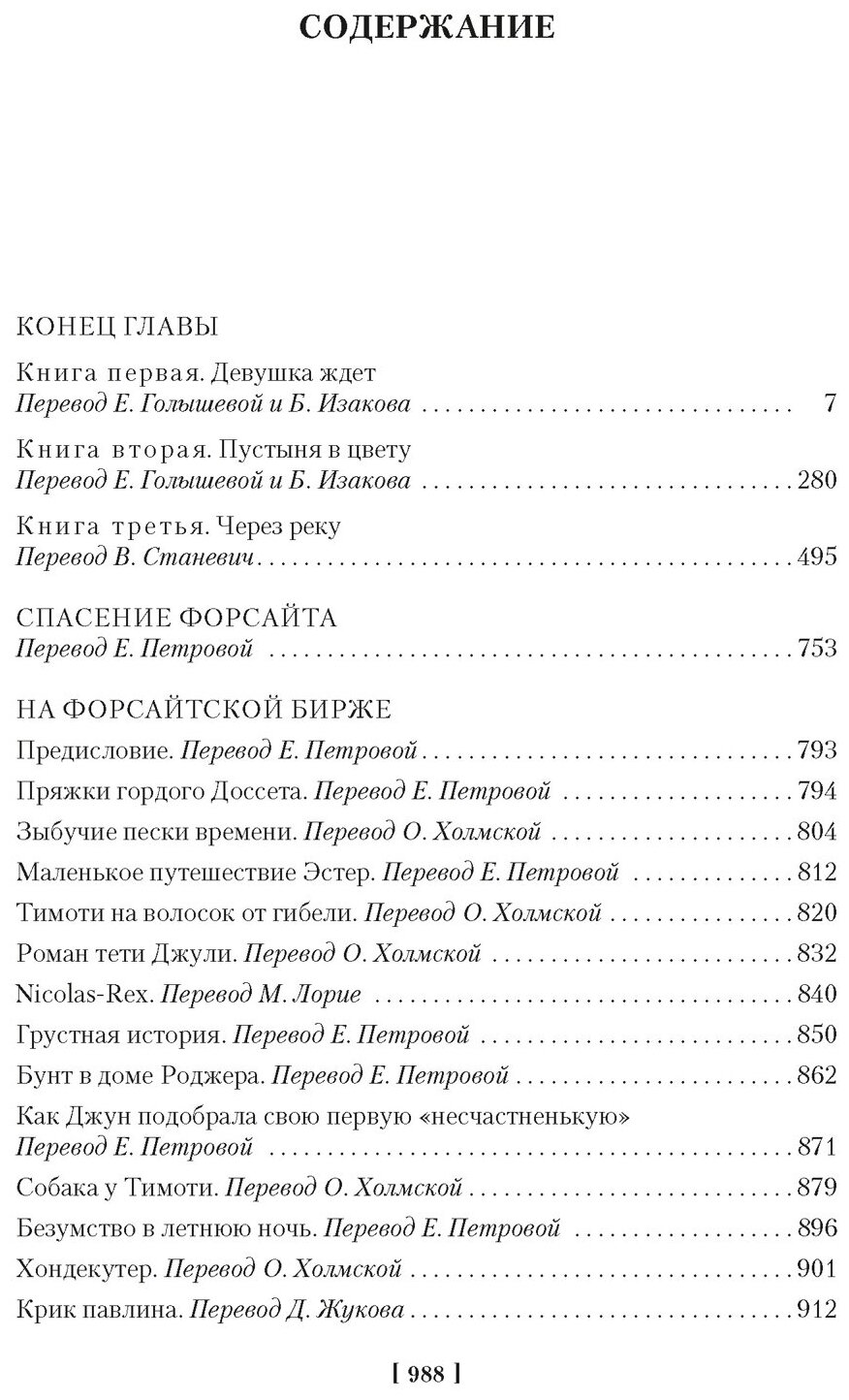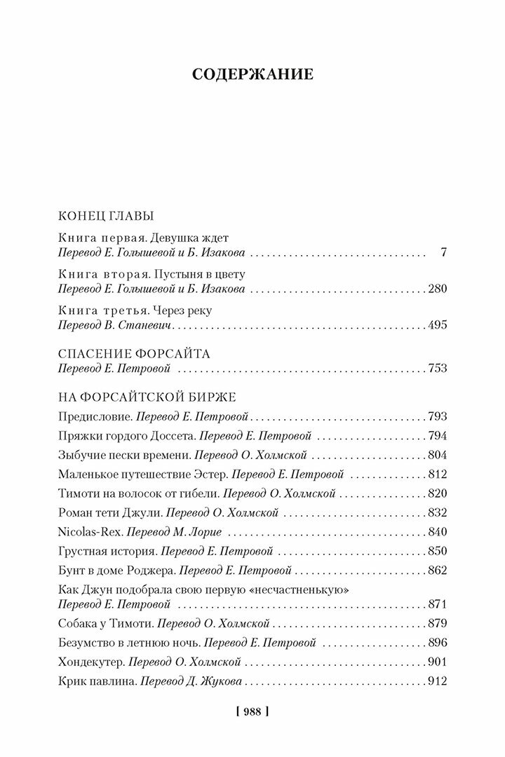В 1932 году английский писатель Джон Голсуорси был удостоен Нобелевской премии «за высокое искусство повествования, вершиной которого является „Сага о Форсайтах“». Этот знаменитый цикл входит в обширные «Хроники Форсайтов», воссоздающие несколько десятилетий истории одной семьи и открывающие мир, скрытый за красивой ширмой успеха: мир потаенных страстей, сломанных судеб, несостоявшегося счастья, безнадежной любви и трагического одиночества. В настоящем издании представлена трилогия «Конец главы», последняя часть «Хроник», три романа о дальних родственниках Форсайтов, обедневших наследниках некогда влиятельного дворянского рода Черрел, приверженцах традиционного жизненного уклада старой Англии. Также в книгу вошли произведения из «Хроник Форсайтов», созданные в малой форме: впервые на русском в полном виде авторский сборник рассказов «На Форсайтской Бирже», в котором собраны истории из жизни Форсайтов разных поколений, и повесть «Спасение Форсайта», представленная в новом переводе, первое произведение из «Хроник», давшее рождение знаменитой саге.