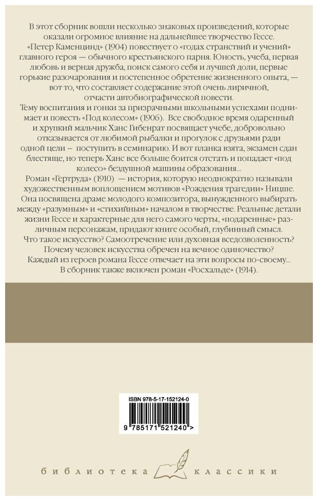 На сегодняшний день товар «Книга: Петер Каменцинд. Под колесом. Гертруда. Росхальде (Герман Гессе); АСТ, Neoclassic, 1904, 1906, 1910, 1914» можно купить с кешбеком в 5 магазинах: ЛитРес, Читай-город, book24, Яндекс.Маркет, Буквоед