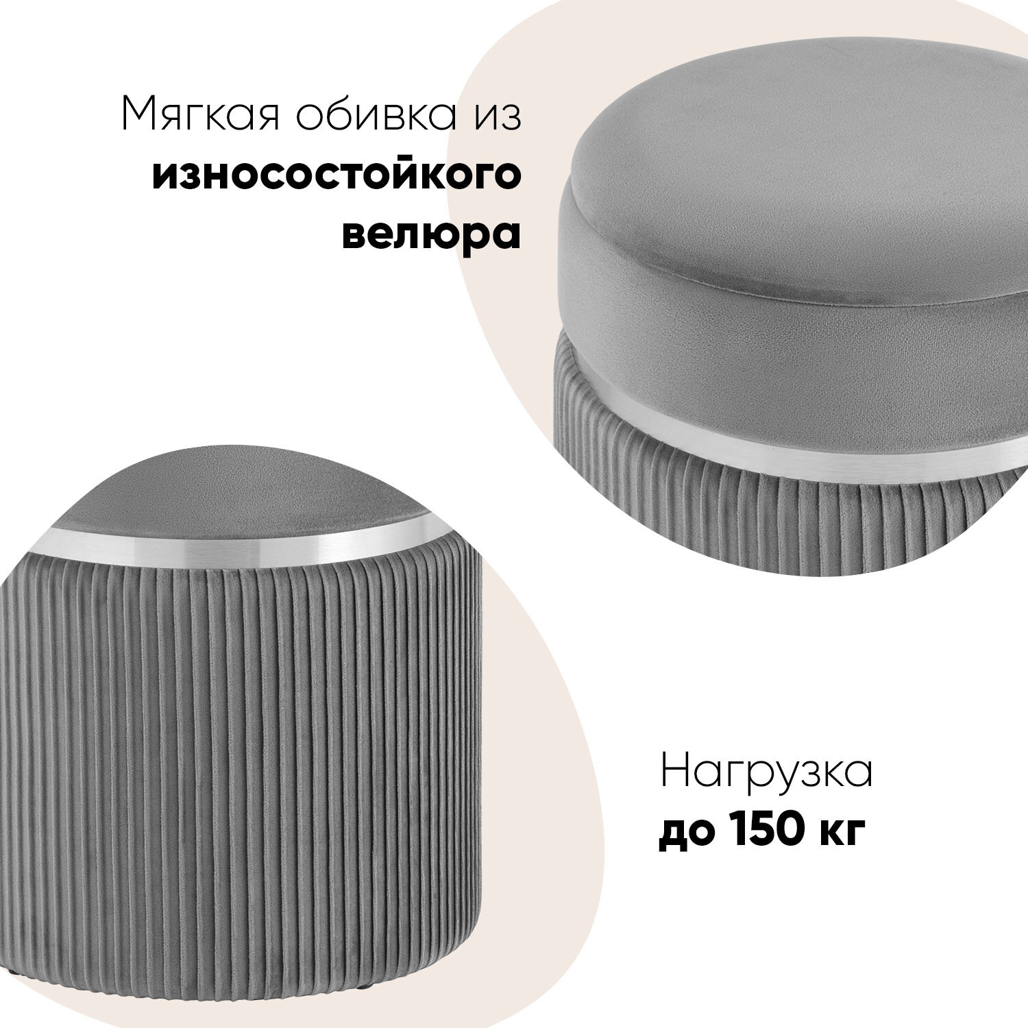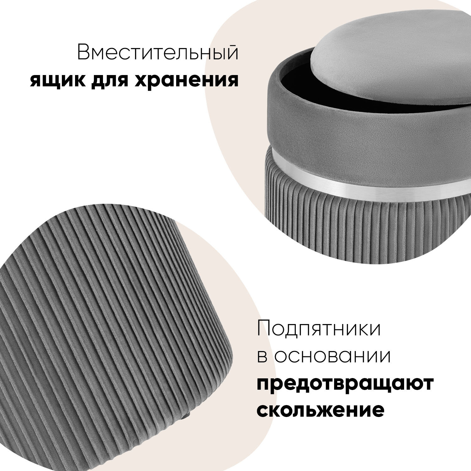 Лаконичная модель пуфа в обивке из мягкого велюра, которая дополнит интерьер вашего дома. Обивка красиво украшена декоративными оборками и металлическим ободком в золотом цвете. Под сиденьем имеется ящик для хранения различных мелочей. В основании предусмотрены специальные подпятники, которые делают пуф более устойчивым и предотвращают скольжение. Высота пуфа: 44 см. Диаметр: 36 см.