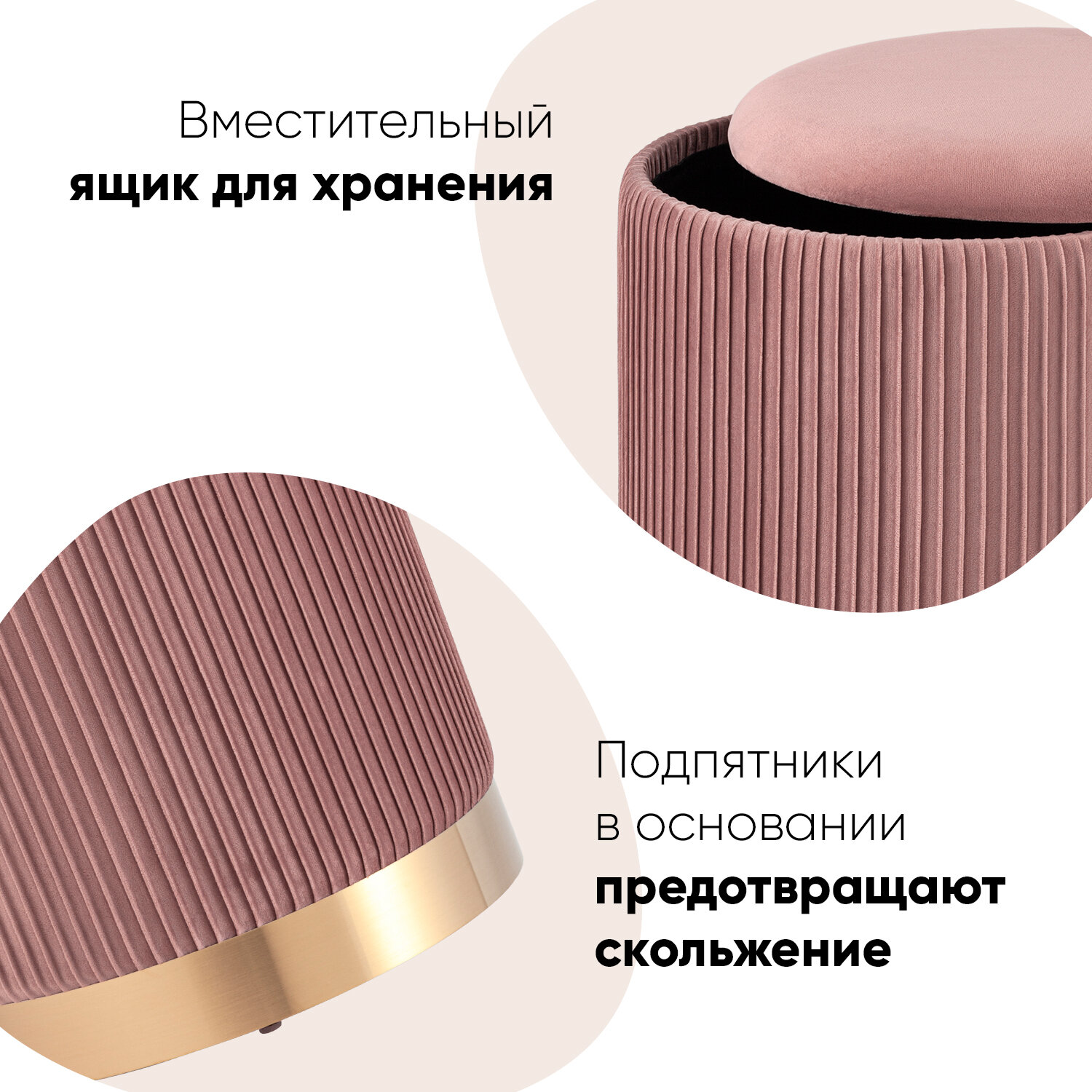 Лаконичная модель пуфа в обивке из мягкого велюра, которая дополнит интерьер в современном стиле. Основание выполнено из металла в золотом цвете. Обивка красиво украшена декоративными оборками. Под сидением имеется ящик для хранения различных мелочей. В основании предусмотрены специальные подпятники, которые делают пуф более устойчивым и предотвращают скольжение. Высота пуфа: 44 см. Диаметр: 36 см.