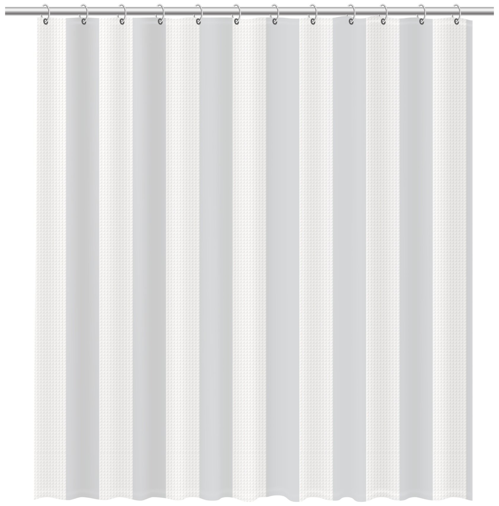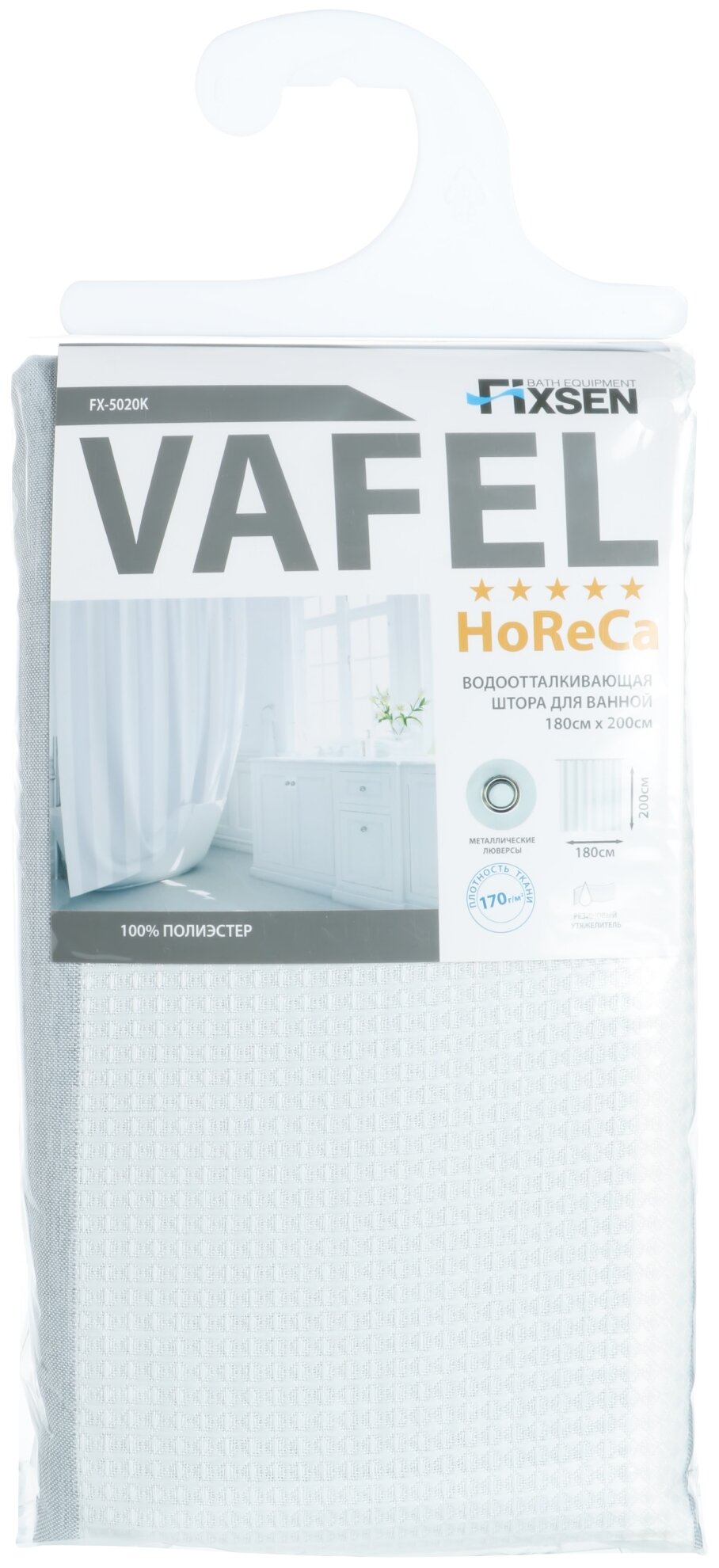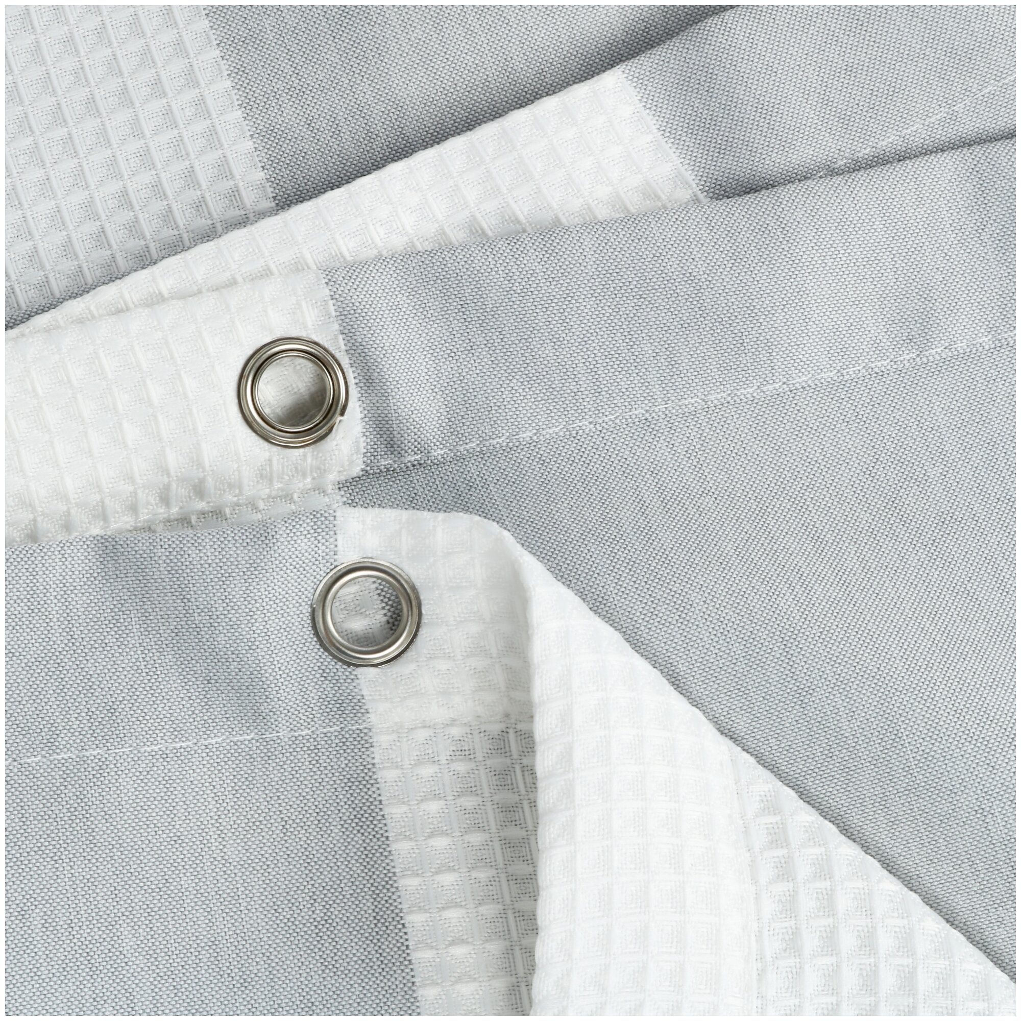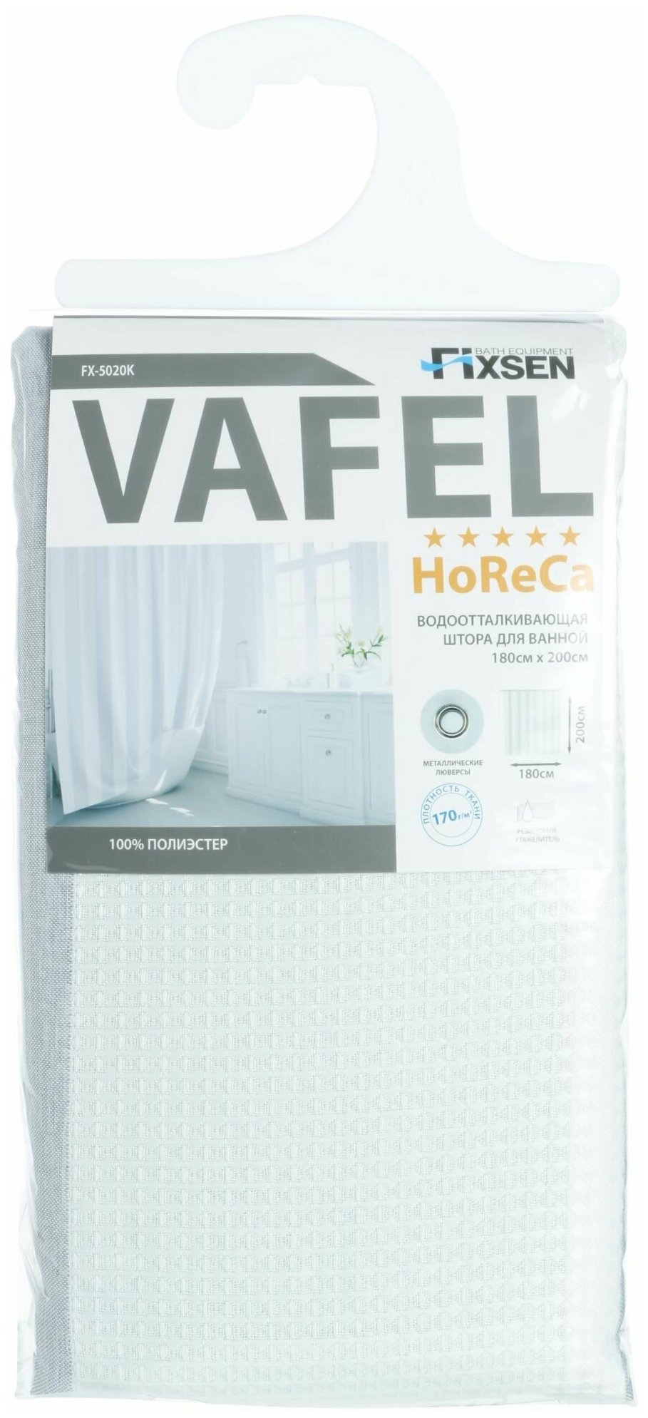 **Штора для ванны Fixsen Vafel** предотвращает разбрызгивание воды на пол ванной комнаты, мебель. Изготовлена из полиэстера. Имеет водоотталкивающую обработку. На поверхность нанесен серый принт в виде полос. Не регулируется по ширине. Крепится к штанге на кольца (не входят в комплект поставки). Для них предусмотрено 12 отверстий с металлическими ушками. Для ухода применяется ручная стирка.
