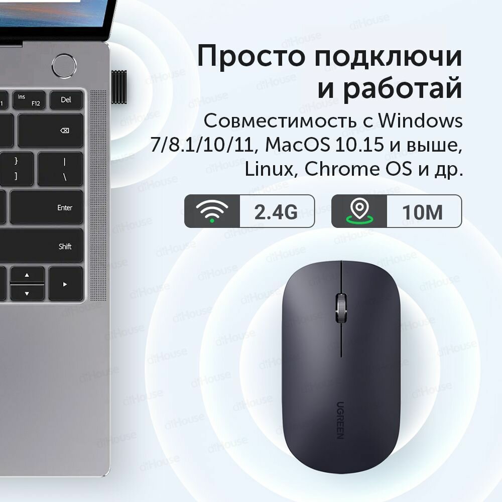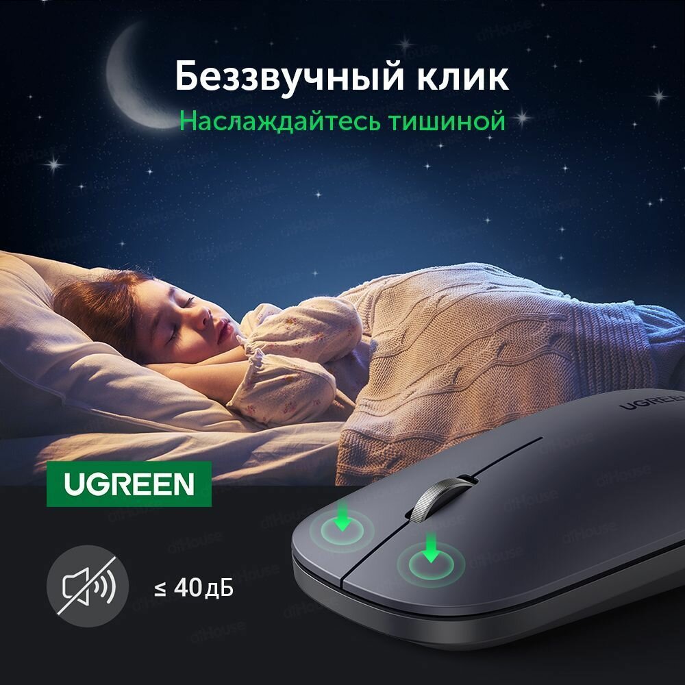 Ugreen использует беспроводное подключение Bluetooth 5.0 и 2.4G, что делает ее универсальным инструментом управления. Благодаря данному типу подключения мышь может использоваться как со стационарными ПК и ноутбуками на базе ОС Windows или Mac OS, а также с портативными устройствами и Smart TV на базе ОС Android.