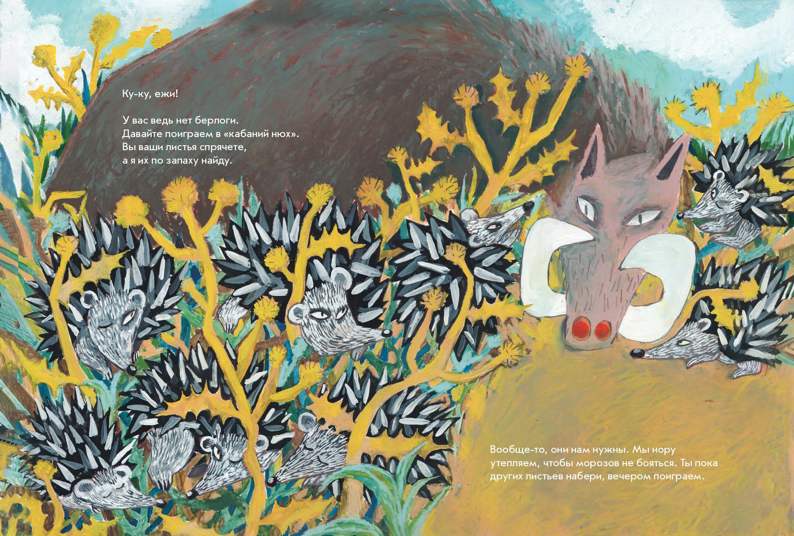 Это отличный комикс, который обманывает читателя с самой обложки: кабан кажется ужасно страшным, и свирепым а на самом деле он — добрейшее существо, просто он заскучал и очень хочет с кем-нибудь поиграть. Только вот весь лес готовится к спячке, занят делом, и никто с ним играть не хочет, и это ужасно расстраивает кабана. Ну кто из нас не оказывался на его месте и не корчил при этом такие же свирепые лица?