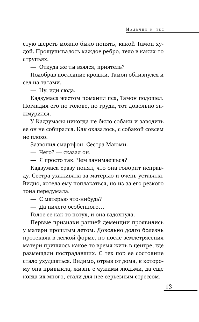 Роман Сэйсю Хасе "Мальчик и пес", проданный в Японии уже более 300 тысяч раз, получил престижную литературную премию имени Сандзюго Наоки в 2020 году. За год девять стран сразу же купили право на издание этой истории. Сэйсю Хасе известен прежде всего романами о якудза, по которым было снято несколько успешных фильмов в Юго-Восточной Азии. "Мальчик и пес" немного выбивается из любимой темы автора, затрагивая жизненные сюжеты, которые берут за душу каждого из нас: потухшая любовь, смертельная болезнь близких, непринятие общества, нищета. Но в этой истории есть место непотопляемой надежде на лучшее и доброте, что присущи человеку независимо от его воспитания, образования, социального статуса или душевного состояния.