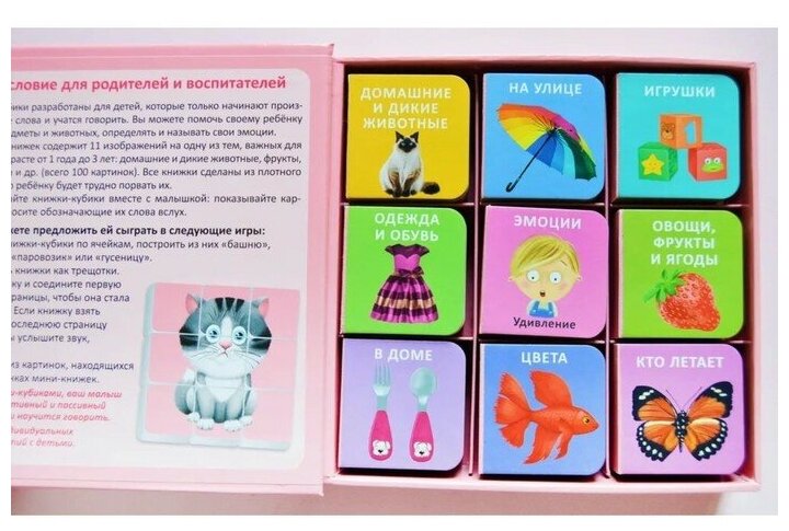 Набор книжек-кубиков «Мини-книжки для малышки» предназначен для девочек, которые только начинают познавать мир и произносить первые слова. Внутри вы найдёте 9 мини-книжек со 100 яркими картинками на самые важные первые темы, которые помогут малышке познакомиться с окружающим миром и запомнить новые слова. С помощью этих книжек-кубиков ваша малышка быстрее научится говорить, познакомится с новыми словами и понятиями, пополнит активный и пассивный словарь. Рассматривайте их вместе с ребёнком, показывайте ей картинки и произносите обозначающие их слова вслух. Стройте из кубиков пирамидки, играйте с книжками как с трещотками, собирайте пазл из картинок, находящихся на обратных сторонках книжек-кубиков. Книжки-кубики изготовлены из плотного картона со скруглёнными уголками, что делает их удобными и безопасными для малыша, а благодаря защитному покрытию набор прослужит очень долго! Более подробную инструкцию вы найдёте внутри коробки.