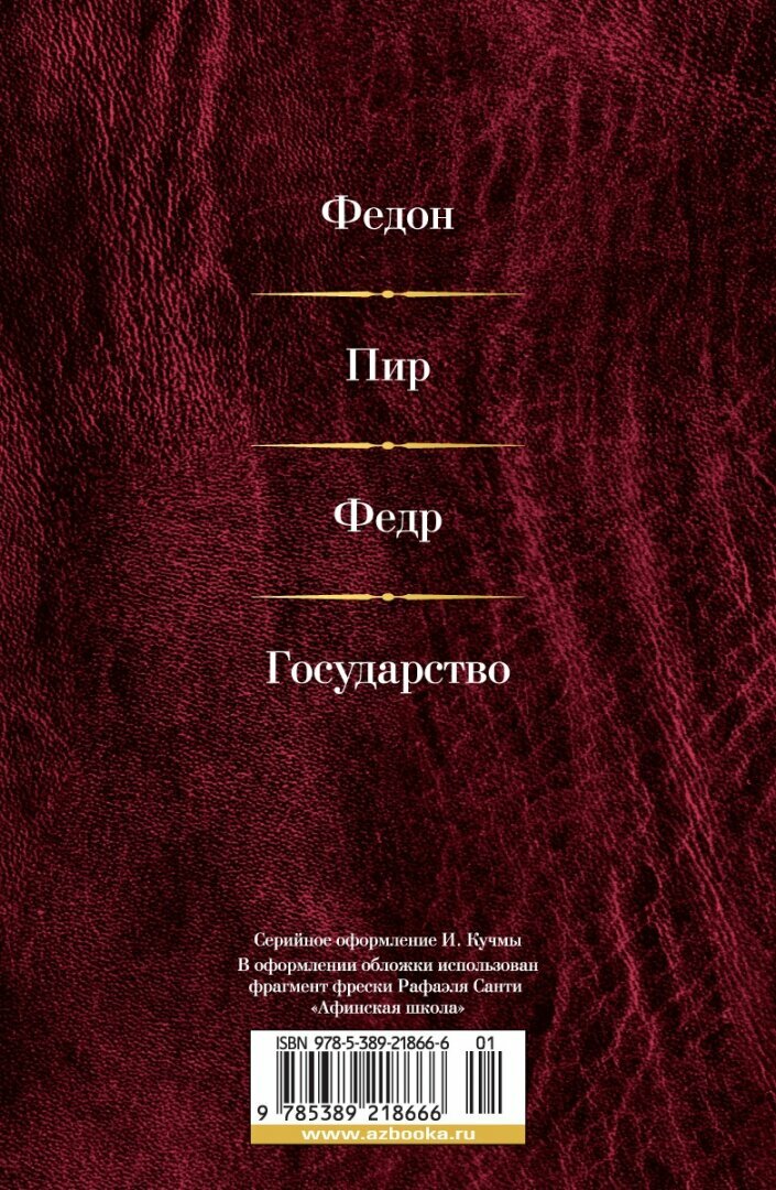 Платон — великий древнегреческий философ, идеи которого оказали огромное влияние на формирование человеческого духа и культуры человеческой мысли последующих столетий. Именно с него, ученика Сократа и учителя Аристотеля, начинается формирование строгого научного мышления. В настоящем издании читателю предлагаются избранные диалоги: «Федон», «Пир», «Федр» и «Государство». В первых трех диалогах затрагивается несколько больших тем: природа философского знания, этическая доктрина в связи с доказательствами бессмертия души и любовь как сила, обращающая личность к познанию и делающая ее богоподобной. В знаменитом «Государстве» философ определяет понятие справедливости, а также рассматривает шесть форм государственного правления — монархию, аристократию, тимократию, олигархию, демократию и тиранию — и дает описание идеального государства, которое управляется философами, «так как только мудрые могут нести заботу о правильном образе жизни всех граждан».
