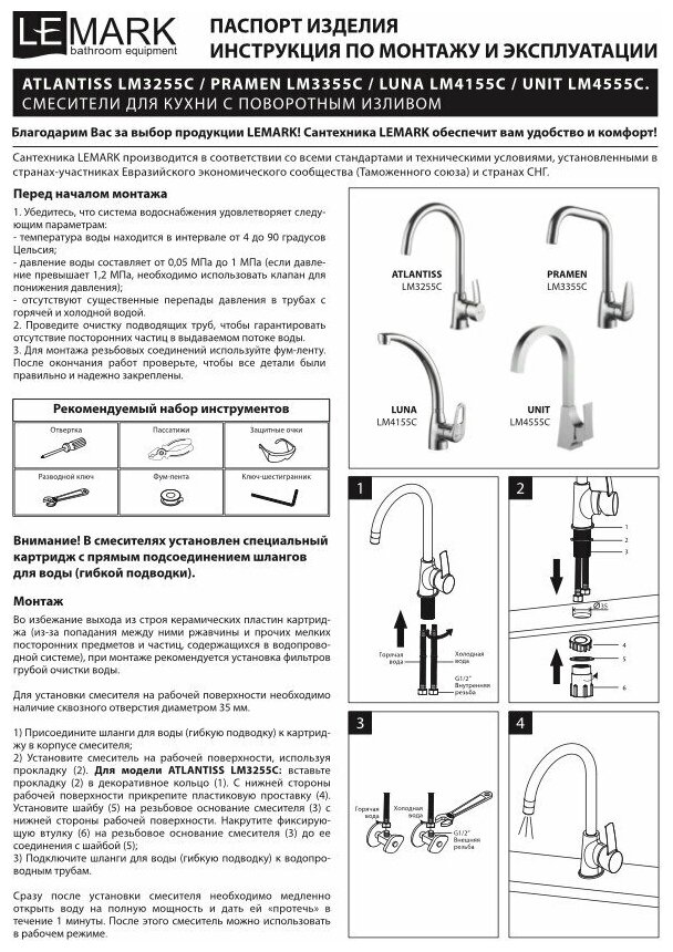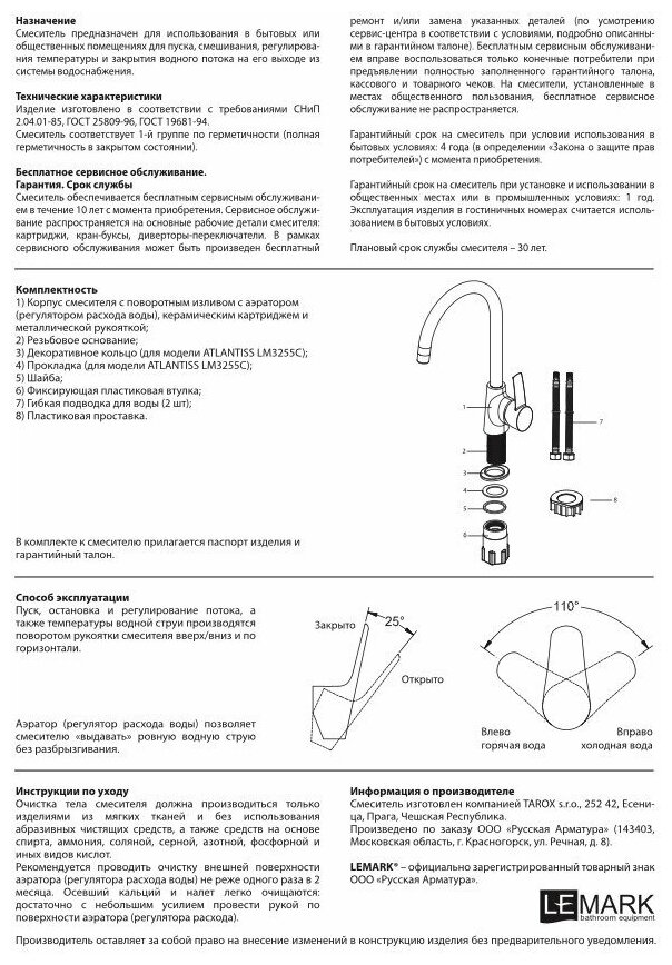 Смеситель Lemark Luna производится в Чехии и обеспечивается бесплатным сервисным обслуживанием в сервисных центрах производителя на территории РФ в течение 10 лет с момента приобретения. Плановый срок службы смесителя составляет 30 лет.