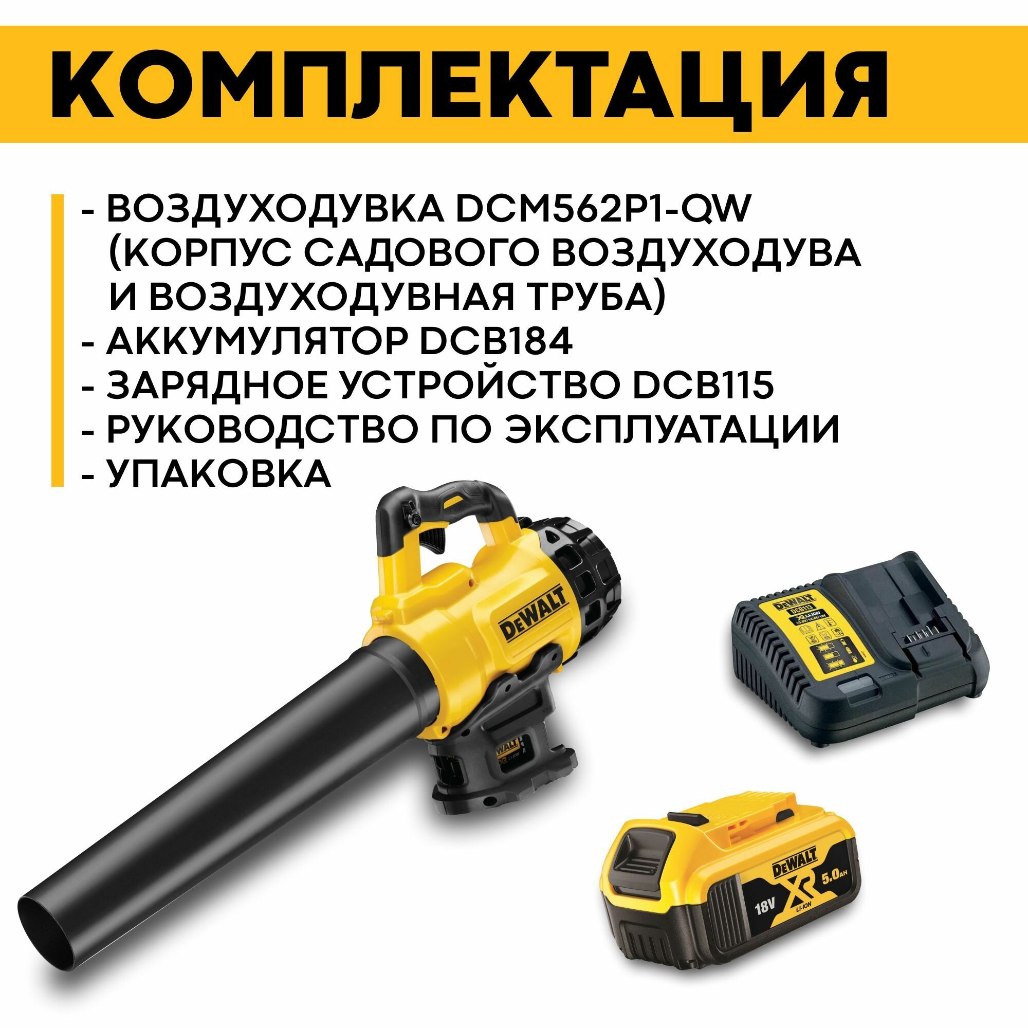 | Прочие особенности и свойства | Комплектация:,- корпус садового воздуходува,- воздуходувная труба,- аккумулятор DCB184,- зарядное устройство DCB115,- руководство по эксплуатации,- упаковка |