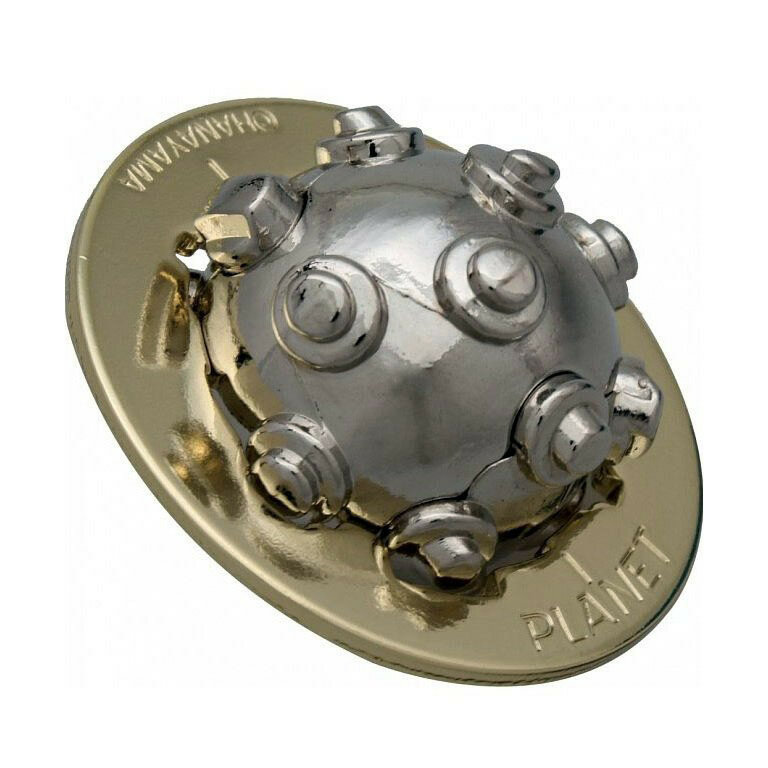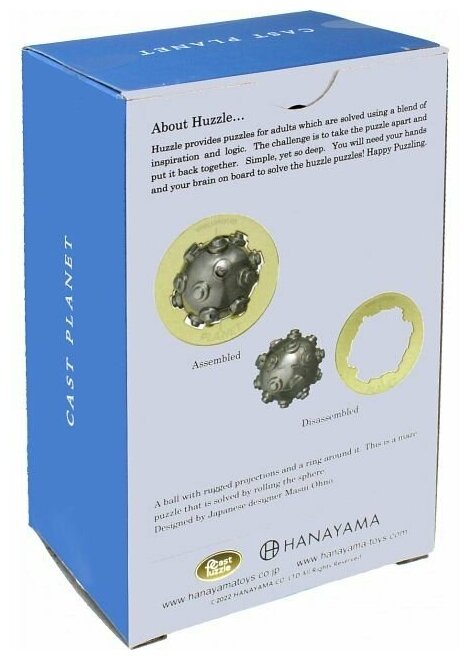 Новая головоломка Hanayama 2022 года. Полностью оправдывает свое название и похожа на планету Сатурн со спутниками. Шар с прочными выступами и кольцом вокруг нее. Это головоломка-лабиринт, которую можно решить, перекатывая сферу. Можно было назвать головоломку вирусом или ковидом, большое сходство также имеется. Но автор головоломки посчитал что это было бы не совсем деликатно. Задание: разберите головоломку на части, а затем соберите снова. Дизайнер Masui Ohno (Япония).