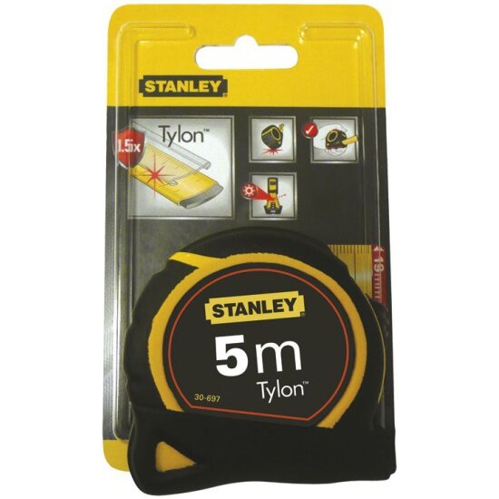 На корпусе измерительной рулетки Tylon 5 м Stanley предусмотрены мягкие вставки из эластомера - для более комфортного удержания приспособления при разметочных, ремонтных работах. Специальное покрытие Tylon мерной ленты способствует ее меньшему износу. Фиксатор на корпусе необходим для торможения ленты в нужном положении. Благодаря зажиму рулетку можно закрепить на поясном ремне.