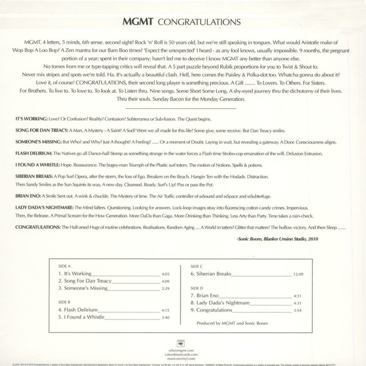 Сongratulations - второй студийный альбом группы MGMT, релиз которого состоялся 13 апреля 2010 года. MGMT (изначально - The Management) - американский музыкальный дуэт, основанный в Бруклине, Нью-Йорк, и состоящий из Эндрю ВанВингардена и Бена Голдвассера. Первоначально сотрудничая с Cantora Records, в 2006 году они подписали контракты с Columbia Records/Red Ink/Sony. После выхода дебютного альбома Oracular Spectacular группа стала известной. 14 ноября 2007 года журнал Rolling Stone поместил MGMT в топ 10 групп-открытий 2008 г. Группа заняла 9-е место в десятке BBC по итогам голосования в 2008 году. Сайтом Last.fmони признаны самой прослушиваемой группой 2008 года. Их дебютный альбом Oracular Spectacular занял 12-е место в UK album chart и стал хитом номер один по мнению журнала Billboard в чарте Top Heatseekers. NME признали этот альбом альбомом года. На протяжении всего 2008 года группа выступала на большом количестве фестивалей Европы