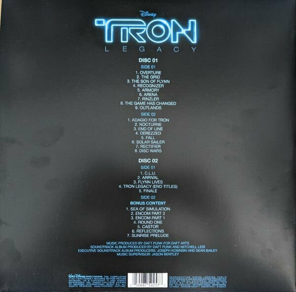 Daft Punk: Tron - Legacy " - саундтрек к фильму "Трон: Наследие" 2010 года, написанный группой Daft Punk.Daft Punk - французский музыкальный электронный дуэт, образованный в 1993 году Томой Бангальтером и Ги-Мануэлем де Омем-Кристо. Музыканты достигли значительного успеха к концу девяностых на волне движения хаус-музыки во Франции, создав собственное звучание, смешав элементы электро, хауса, диско и синтипопа. Оказали значительное влияние на формирование собственно французского хауса."Трон: Наследие" (также известен как TR2N и Tron 2) - американский блокбастер в жанре киберпанк, снятый студией Walt Disney Pictures и выпущенный в 2010 году. Сиквел фильма "Трон" 1982 года. Режиссёрский дебют Джозефа Косински; режиссёр предыдущего фильма Стивен Лисбергер выступил в качестве продюсера. Джефф Бриджес играет роль Кевина Флинна, а Гаррет Хедлунд играет взрослого сына Флинна, по имени Сэм.Дополнительные материалы:- Винил 180 г- ПереизданиеСписок музыкальных треков:1. A1. Overture2. A2. The Grid3. A3. The Son Of Flynn4. A4. Recognizer5. A5. Armory6. A6. Arena7. A7. Rinzler8. A8. The Game Has Changed9. A9. Outlands10. B1. Adagio For TRON11. B2. Nocturne12. B3. End Of Line13. B4. Derezzed14. B5. Fall15. B6. Solar Sailer16. B7. Rectifier17. B8. Disc Wars18. C1. C. L. U.19. C2. Arrival20. C3. Flynn Lives21. C4. TRON Legacy (End Titles)22. C5. Finale23. D1. Sea Of Simulation24. D2. Encom Part 225. D3. Encom Part 126. D4. Round One27. D5. Castor28. D6. Reflections29. D7. Sunrise Prelude