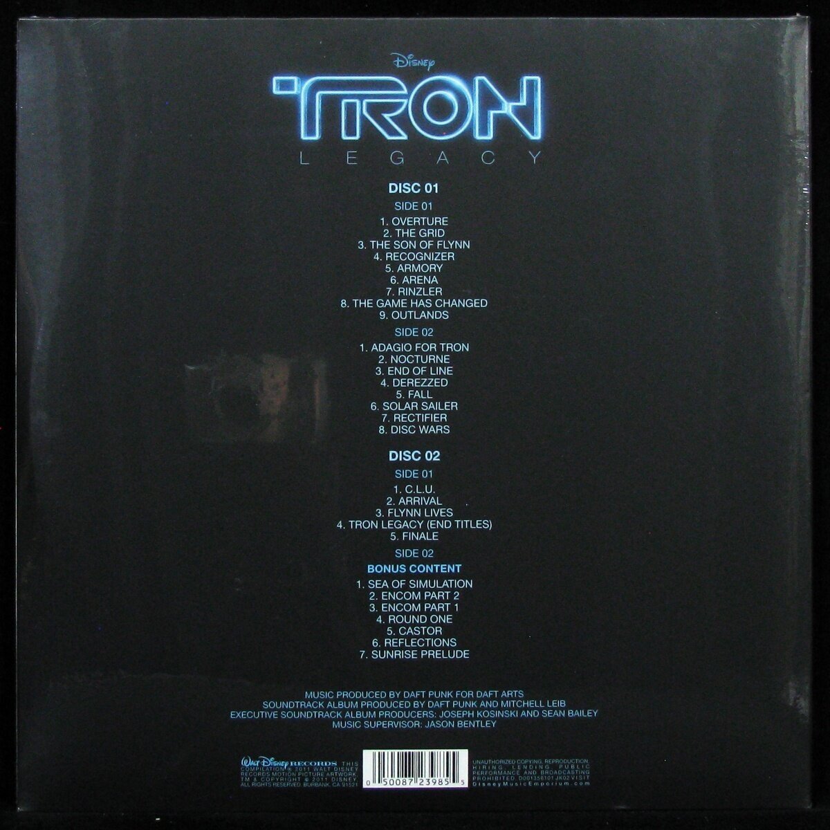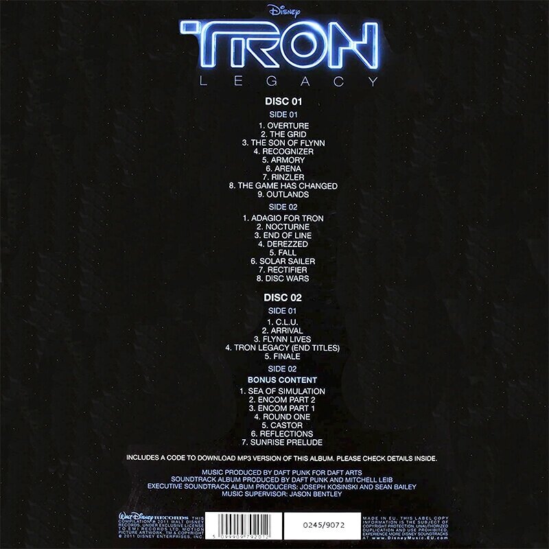 | Трек-лист | Overture, The Grid, The Son Of Flynn, Recognizer, Armory, Arena, Rinzler, The Game Has Changed, Outlands, Adagio For TRON, Nocturne, End Of Line, Derezzed, Fall, Solar Sailer, Rectifier, Disc Wars, C.L.U., Arrival, Flynn Lives, TRON Legacy (End Titles), Finale, Sea Of Simulation, Encom Part 2, Encom Part 1, Round One |