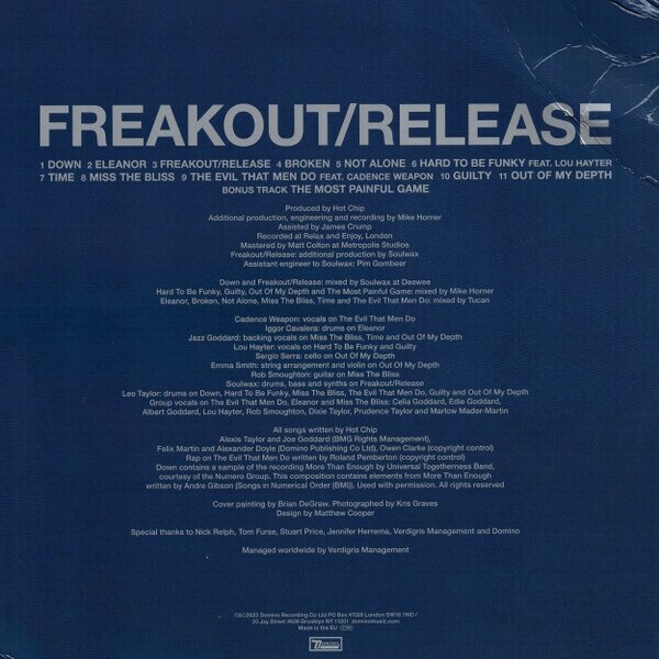 "Freakout/Release" - восьмой студийный альбом популярного лондонского элетро-поп квинтета Hot Chip, выпущенный в 2022 году. Издание на двойном виниле в разворотном конверте содержит один бонусный трек и код на скачивание альбома. Hot Chip - британская группа, выпускающая популярную электронную музыку, созданная в 2000 году Алексисом Тейлором и Джо Годдардом. В состав группы также входят Оуэн Кларк, Эл Дойл и Феликс Мартин.