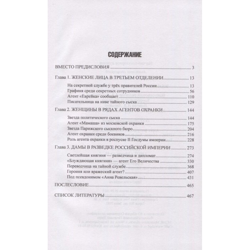 Среди героинь очерков - те, кто служил в секретной агентуре III отделения, а также те, кто связал свою жизнь с Охранным отделением. Отдельно идёт рассказ о женщинах, посвятивших себя служению Отечеству в российской разведке.