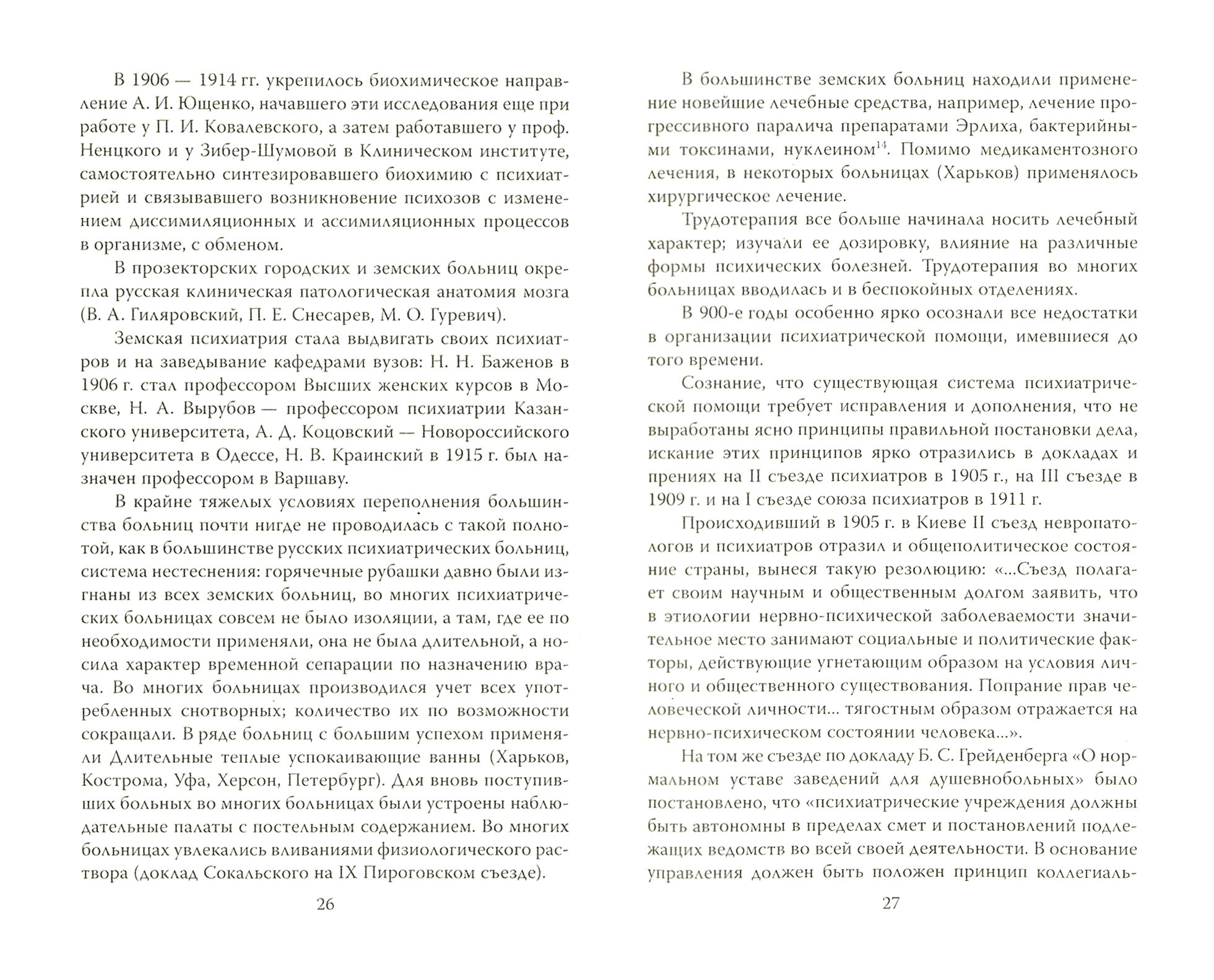 Термин "психиатрия" пришел в Россию из Западной Европы в начале XIX в. и распространялся параллельно с открытием домов для душевнобольных. При этом количество комплексных работ по истории становления и развития института российской психиатрии в XIX - XX веках крайне мало. Данная книга, которую автор не успел дописать из-за своей смерти в 1949 году, считается лучшей и наиболее информативной по теме истории психиатрии в России первой половине XX века.