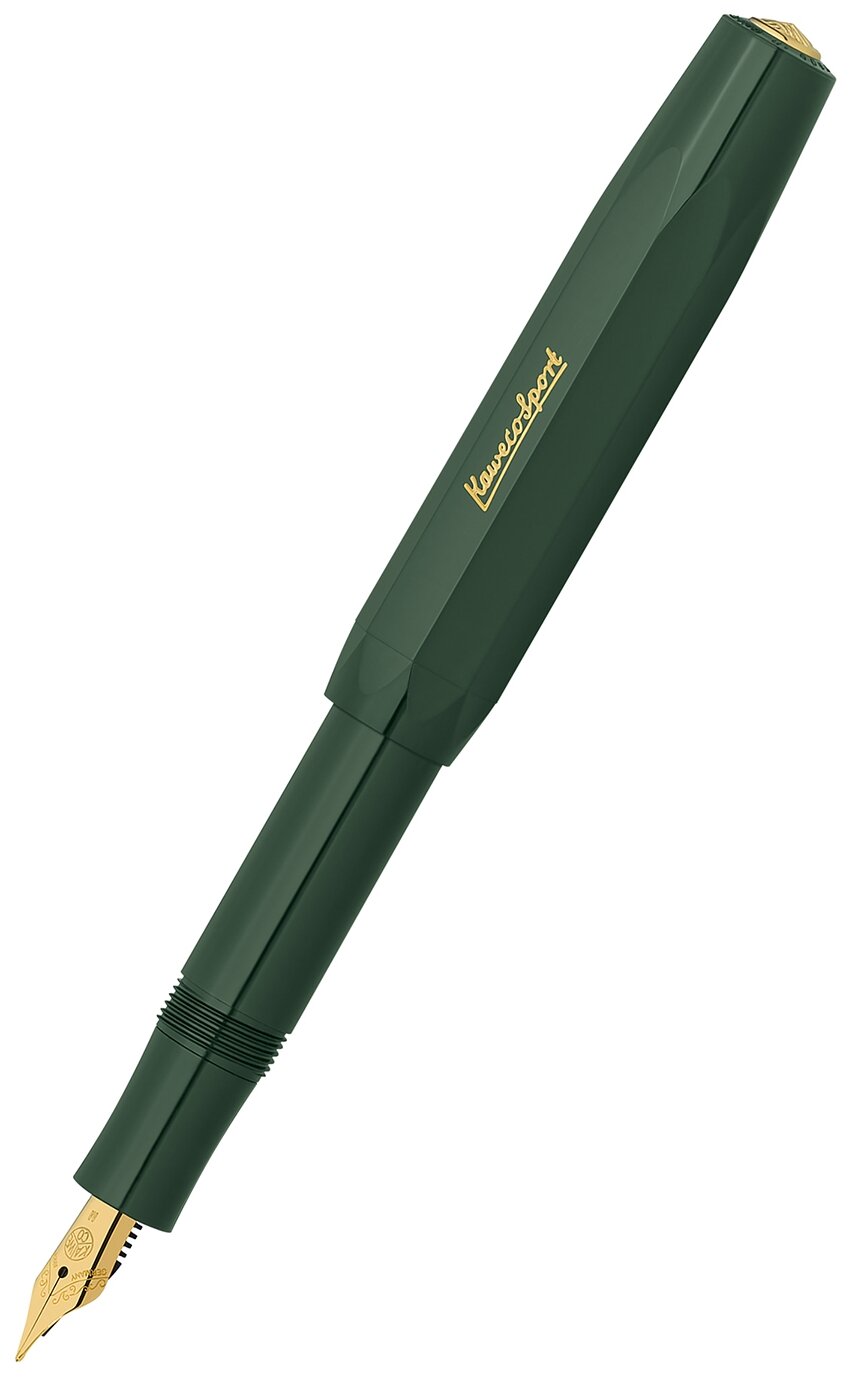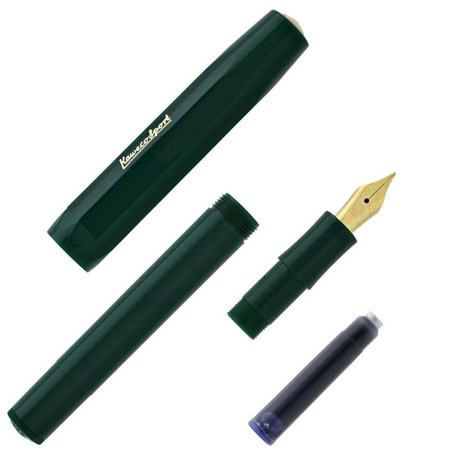 Винтажная перьевая ручка от Kaweco (дизайн серии остался неизменным с 1936 года). Удобный карманный размер. Массивный восьмигранный колпачок на резьбе. Позолоченное стальное перо (23Кт) с иридиевым наконечником. Длина ручки в закрытом состоянии - 10.5 см. Корпус из прочного ABS-пластика и поликарбоната. К ручке подходят сменные картриджи Kaweco стандарта International (short) и съемный клип к восьмигранным ручкам Kaweco (продается отдельно). Синий картридж в комплекте.