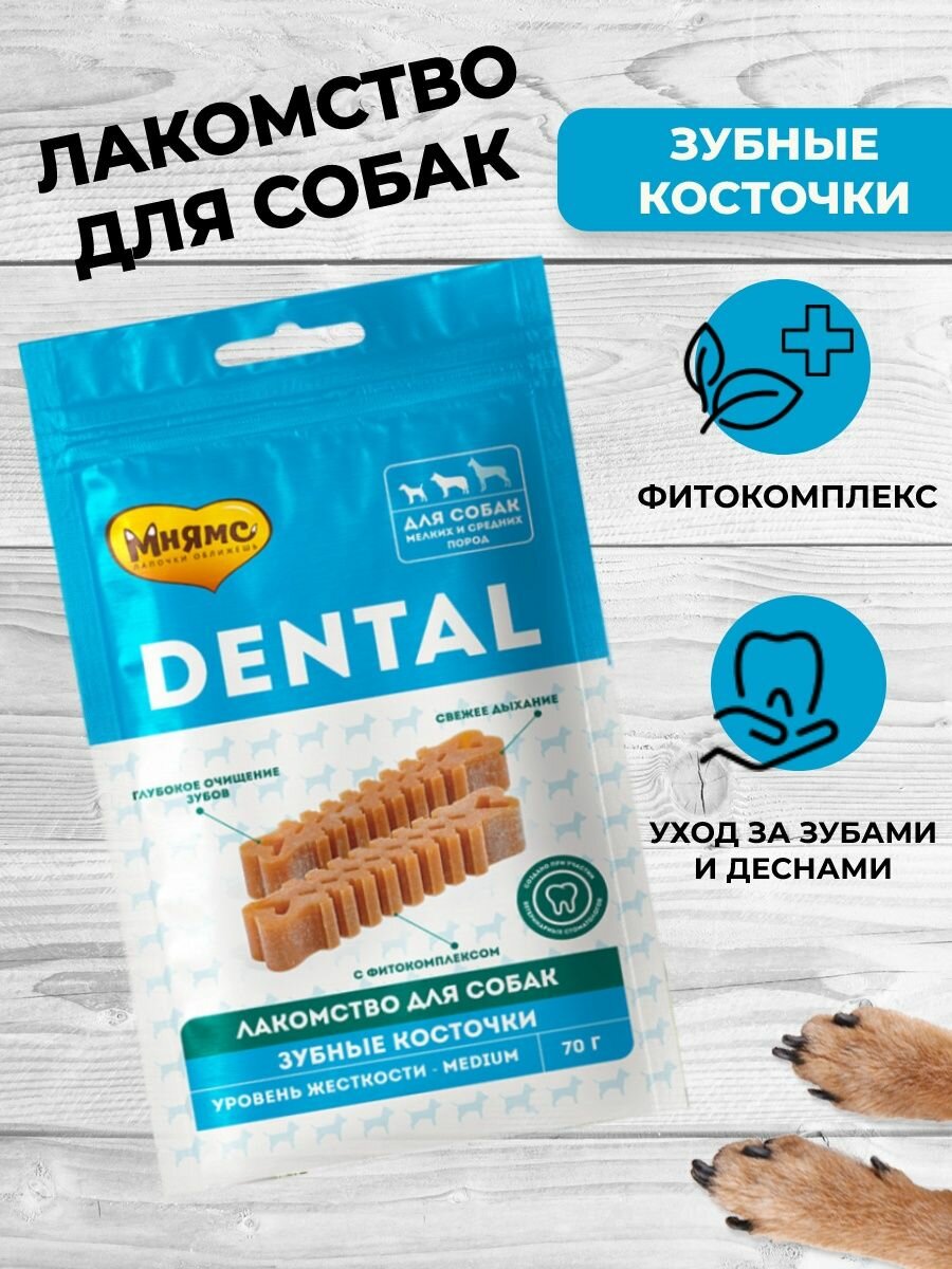 Мнямс DENTAL "Зубные косточки" – вкусное и полезное лакомство для взрослых собак и щенков старше 3-х месяцев. Обладают высокой вкусовой привлекательностью и прекрасной поедаемостью. Благодаря особой форме гарантируют тщательное очищение даже самых труднодоступных мест полости рта, предотвращают появление налета и обеспечивают профилактику появления зубного камня, обладают антибактериальным и освежающим действием.