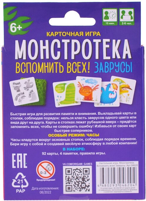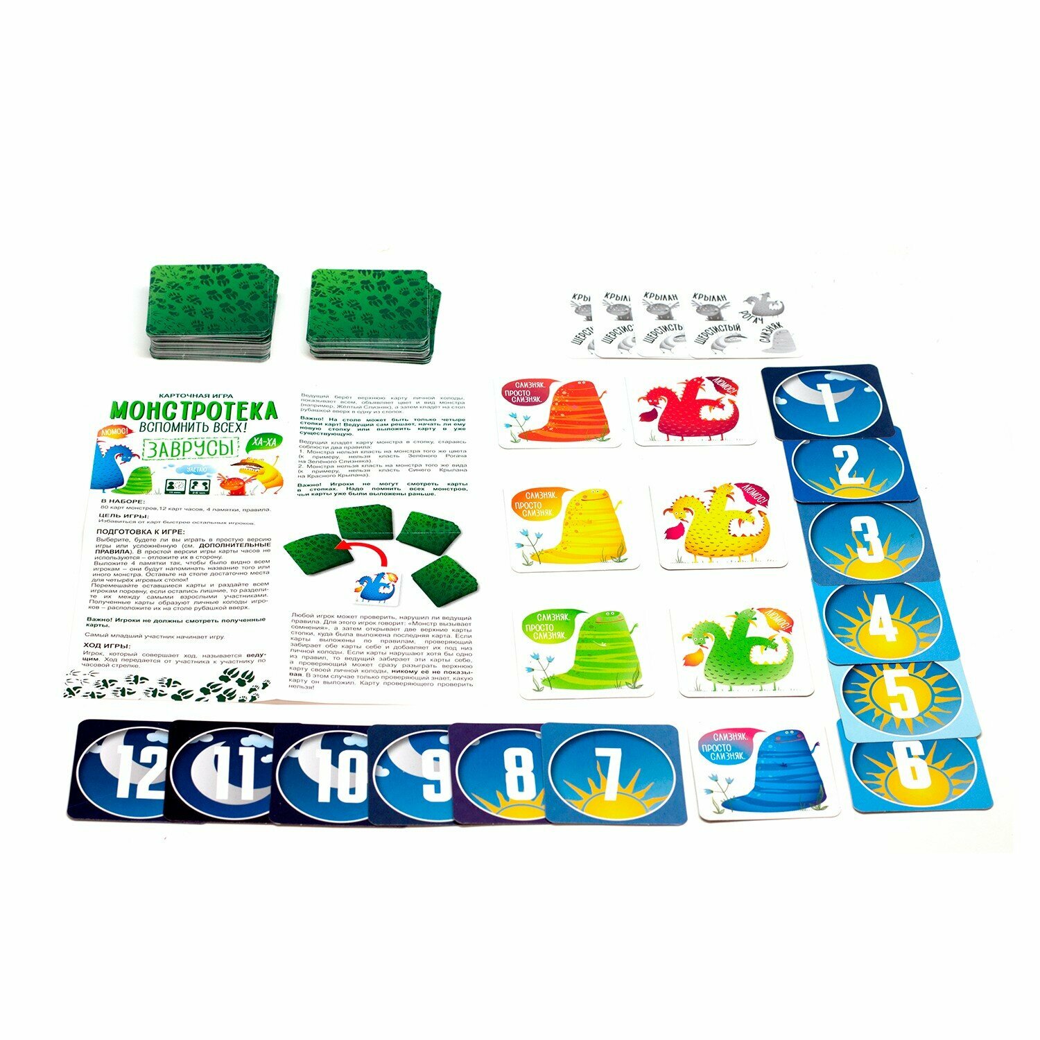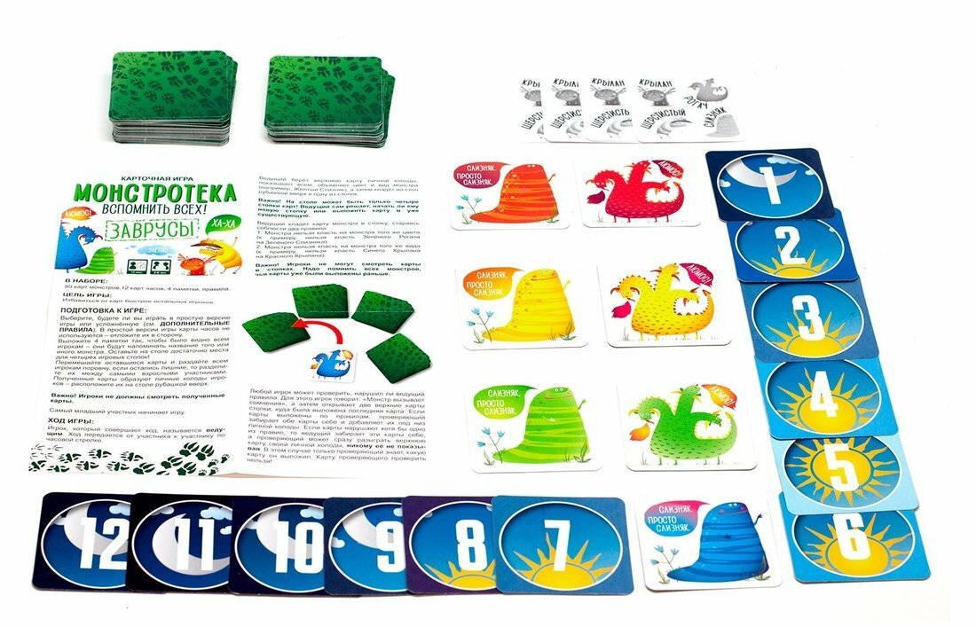Быстрая игра для развития памяти и внимания. Выкладывай карты в стопки, соблюдая порядок: нельзя класть заврусов одного цвета или вида друг на друга. Карты в стопках лежат рубашкой вверх - придется запомнить всех, чтобы не совершить ошибку! Избавься от своих карт быстрее соперников. Особый режим: часы. Часы кладутся вокруг основных стопок, соблюдая порядок времени.