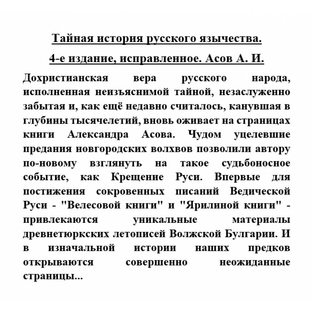 «Тайная история Русского Язычества. Книга купила и очень рада! Очень много информации, которая будет полезна не только язычникам, но и всем, кто интересуется историей нашей страны. Автор рассказывает о том, когда появилась русская вера, как она развивалась, почему в ней есть и черты язычества, и христианские. Описывает разные верования наших предков, такие как славянский пантеон, волхвы, духи и боги, их имена и деяния.