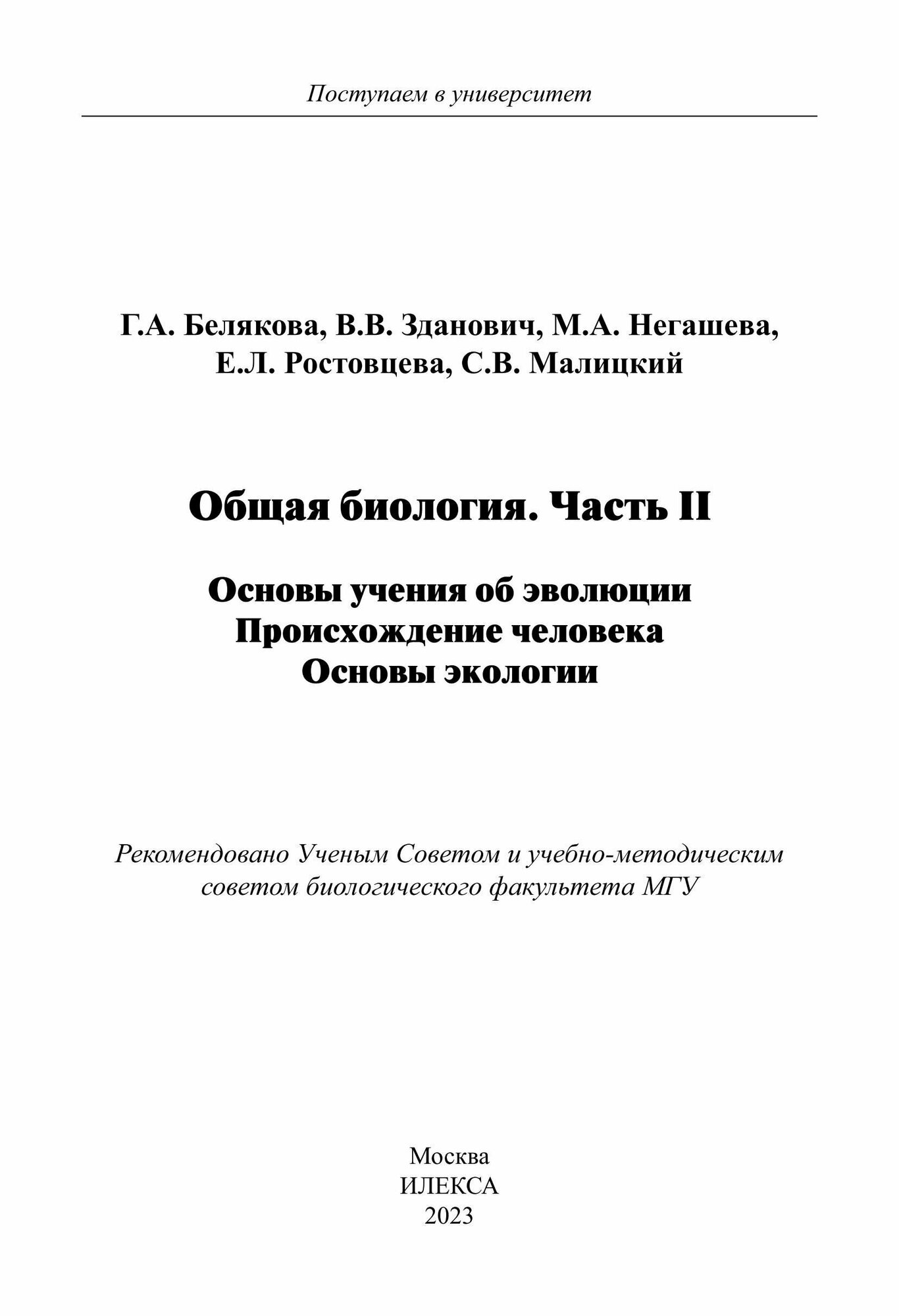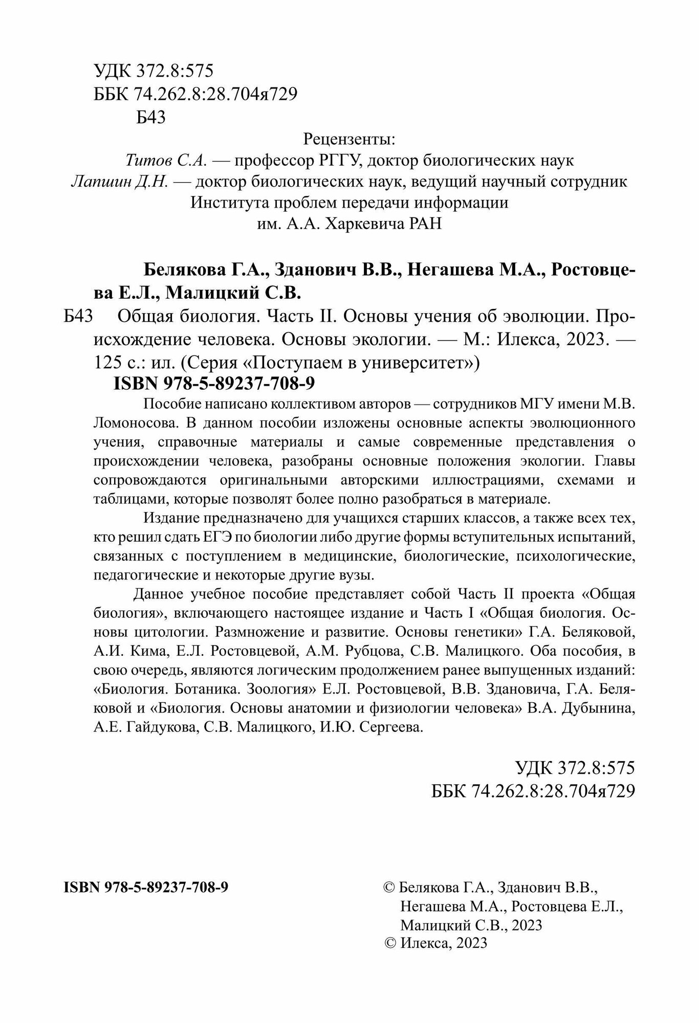 Общая биология. Часть II. Основы учения об эволюции. Происхождение человека. Основы экологии (Белякова Галина Алексеевна, Зданович Владимир Владимирович, Негашева Марина Анатольевна); Илекса, 2023
