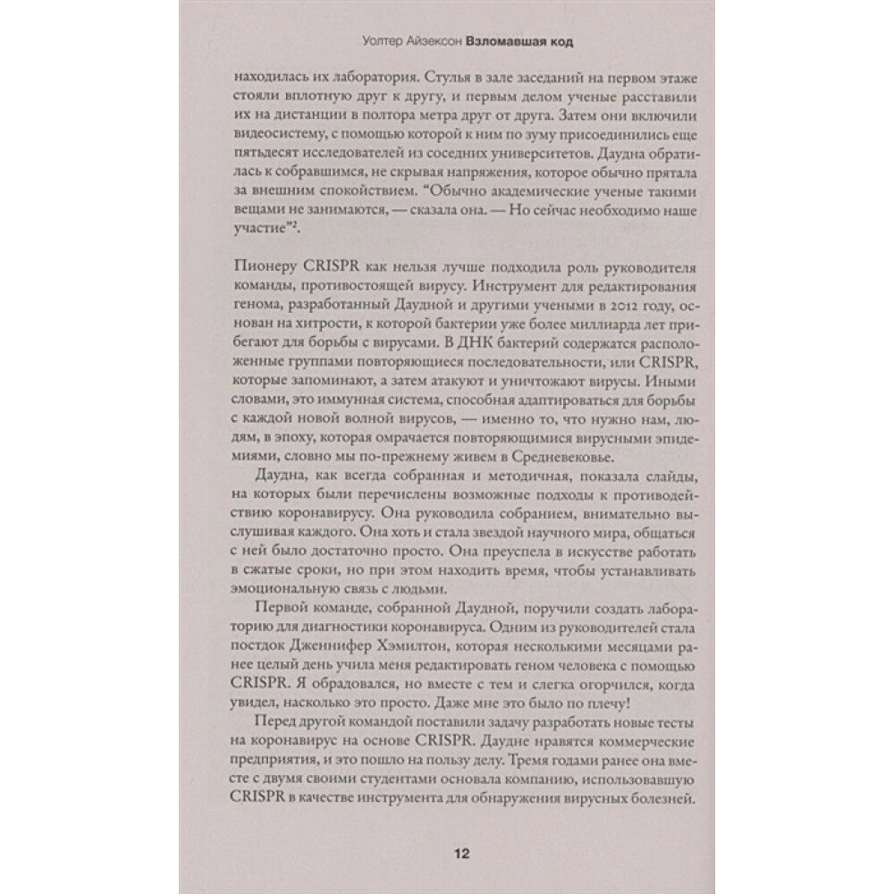 Великолепная биография изобретательницы того, что называют величайшим достижением в биологии со времен открытия ДНК . Тем, кто знаком с биологией на университетском уровне, будет проще разобраться в теме, но никто не пожалеет о прочитанном. Важнейшая книга о новом событии в науке – и еще одна первоклассная биография от Айзексона. Kirkus reviews (нет на сайте)