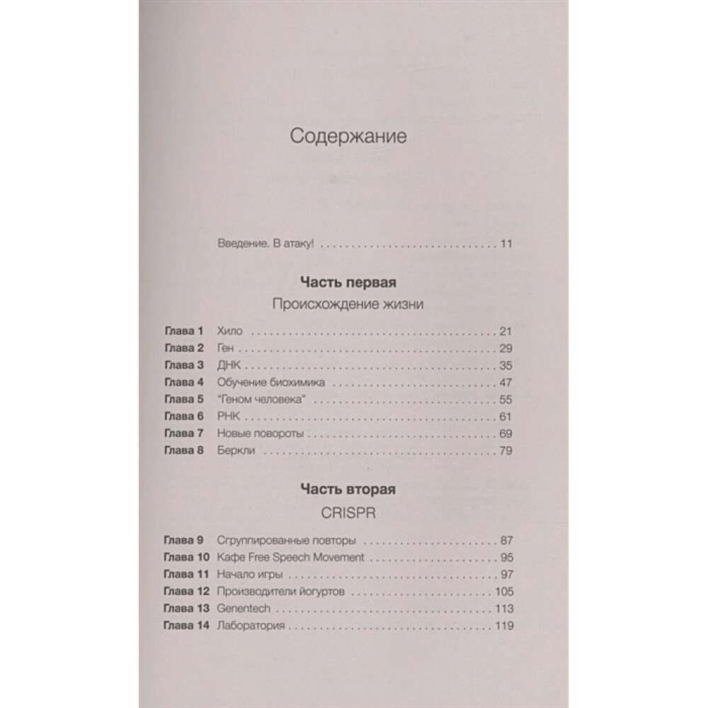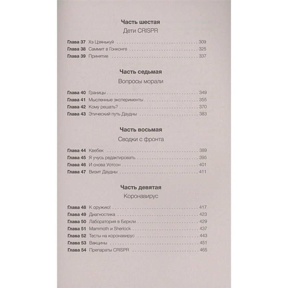 Однако эта книга – не только биография Даудны, но и история развития науки о генетике. Наряду с доступным объяснением того, что именно Даудна и ее коллеги открыли и разработали, в этой книге также рассмотрены и менее обсуждаемые аспекты современной науки: борьба за финансирование, противоречия между целями академических исследований (научный прогресс) и интересами частного сектора (прибыль), трудный процесс публикации и патентования открытий, а также противостояние между учеными.