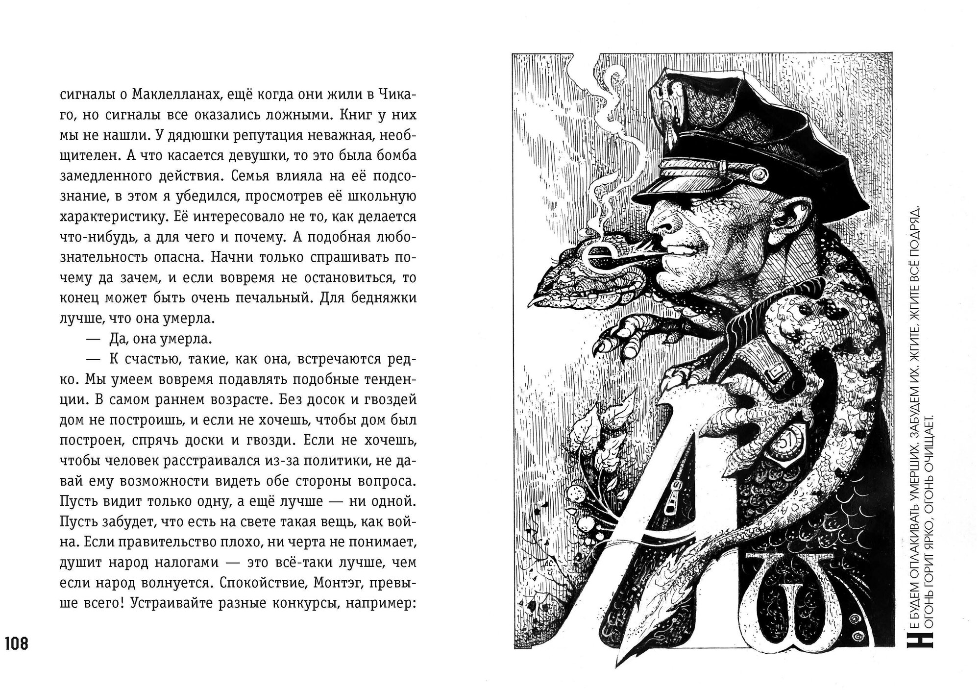 «Мы все должны быть на одно лицо. Никто не рождается свободным и равным, как гласит Конституция, все делаются равными. Если каждый - зеркальное отражение всех остальных, тогда и счастливы все без исключения, потому что вокруг нет горных вершин, заставляющих людей съеживаться от страха, потому что не с кем мериться ростом.»