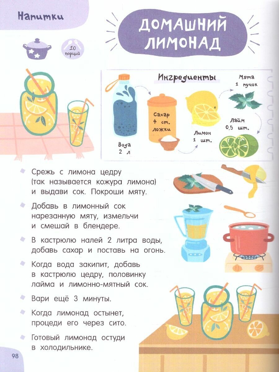 Пошаговое описание простых, но привлекательных для детей блюд: завтраки, обеды, ужины, десерты, бутерброды, салаты, напитки, смузи. Понятные ребенку единицы измерения - стакан, чайная ложка. Яркие иллюстрации, выполненные в стиле современных мультфильмов.
