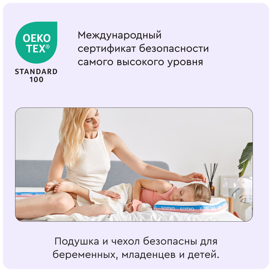 Подушка также оснащена гипоаллергенной пеной с эффектом памяти Memory Foam европейского производства, и имеет международный сертификат безопасности Oeko-Tex®. Создает ортопедический эффект для здорового и счастливого сна.