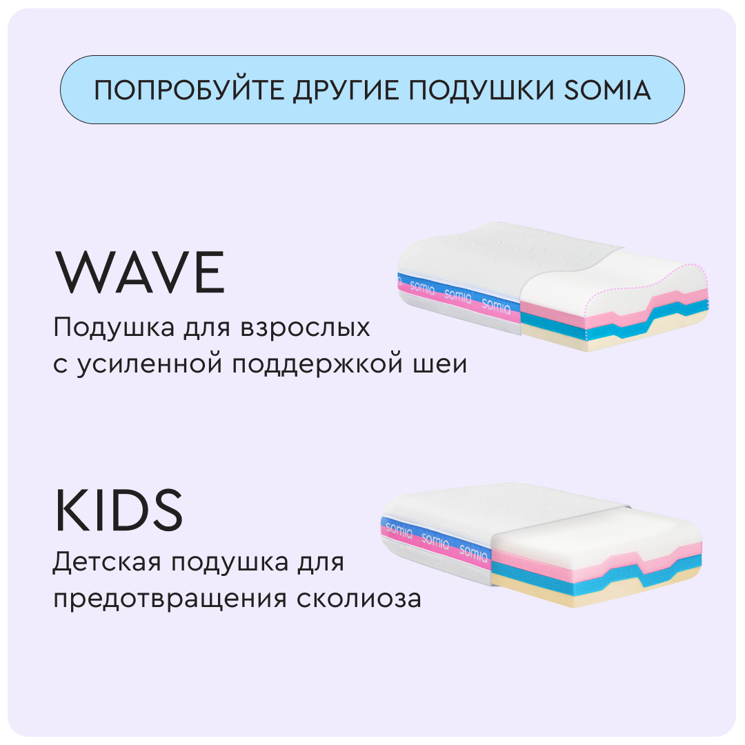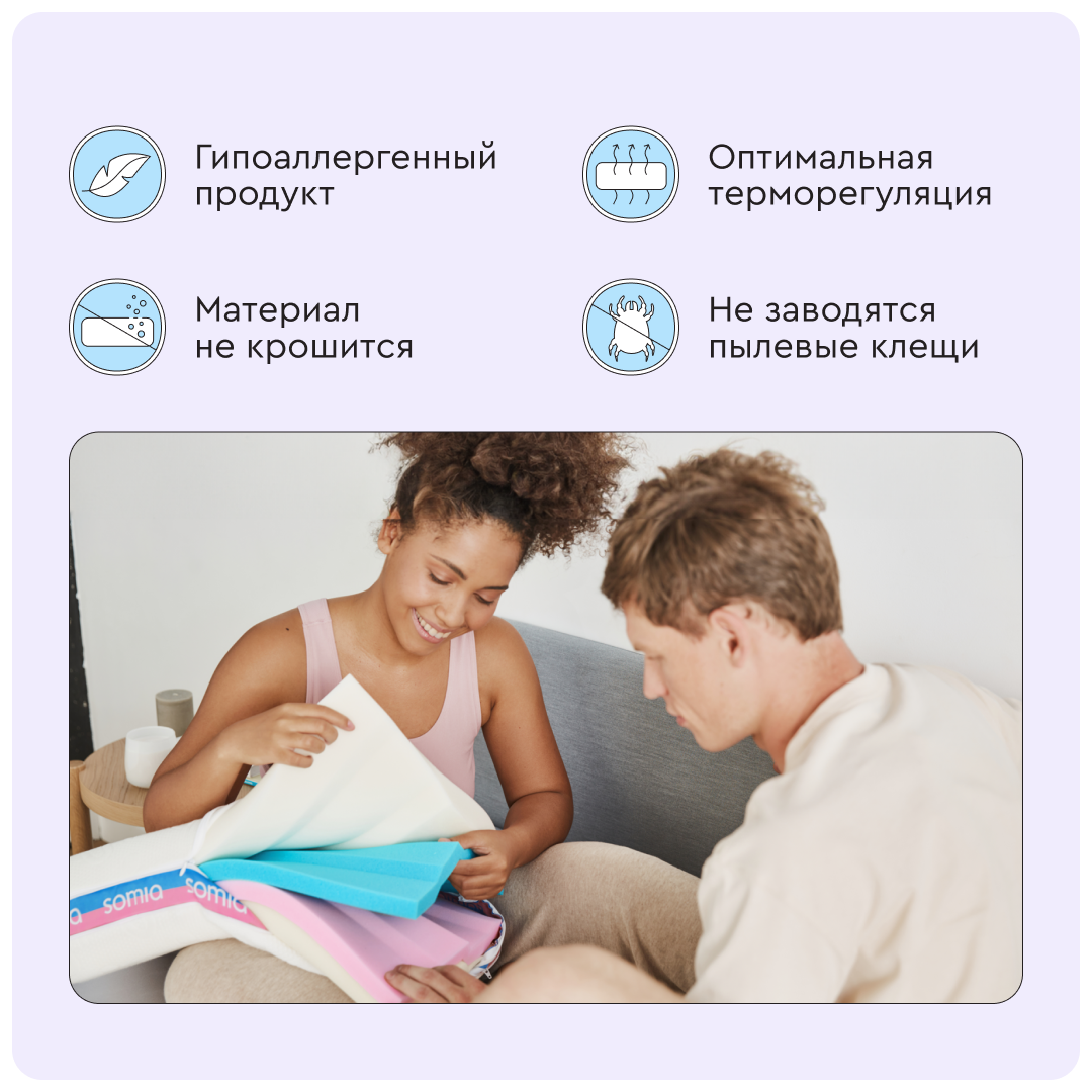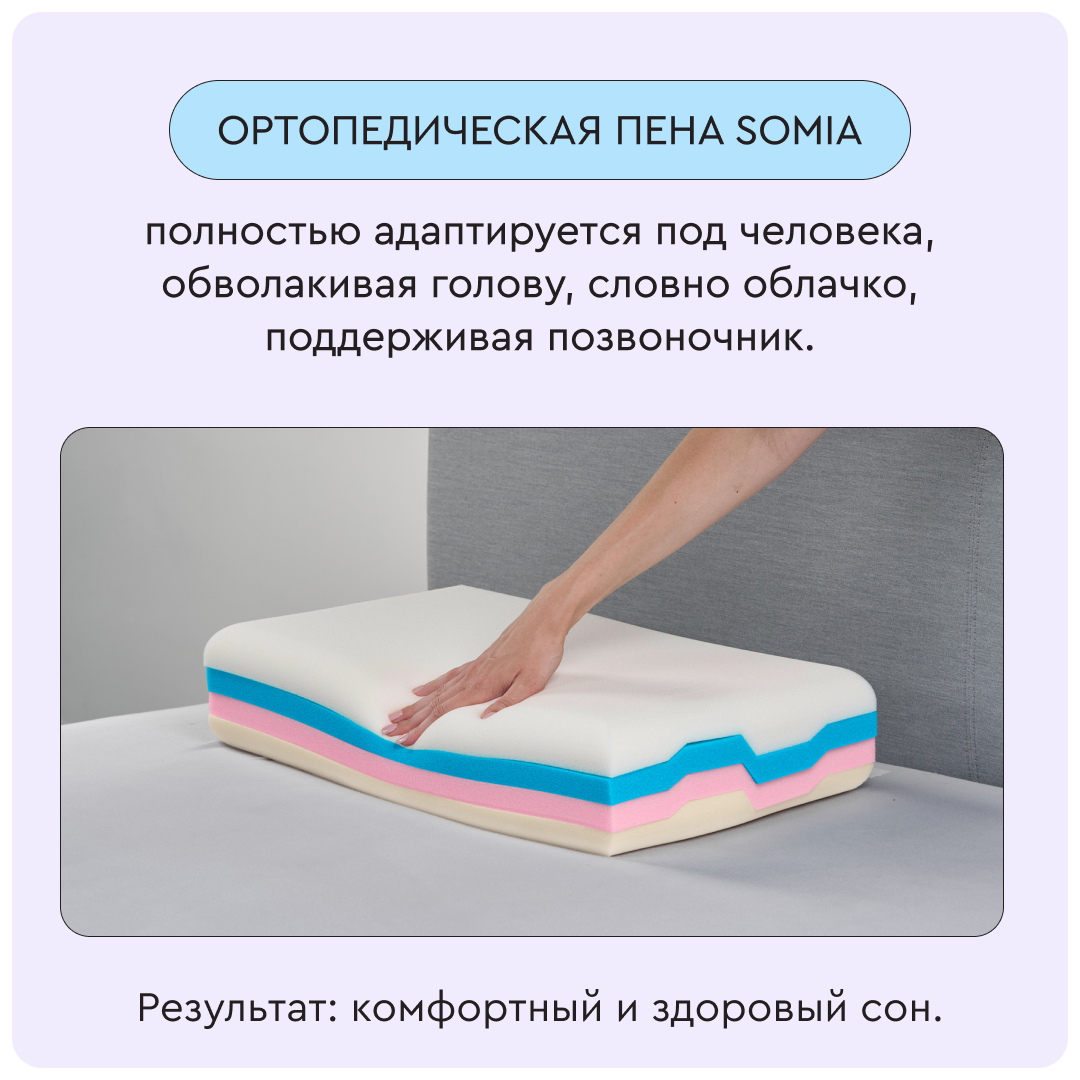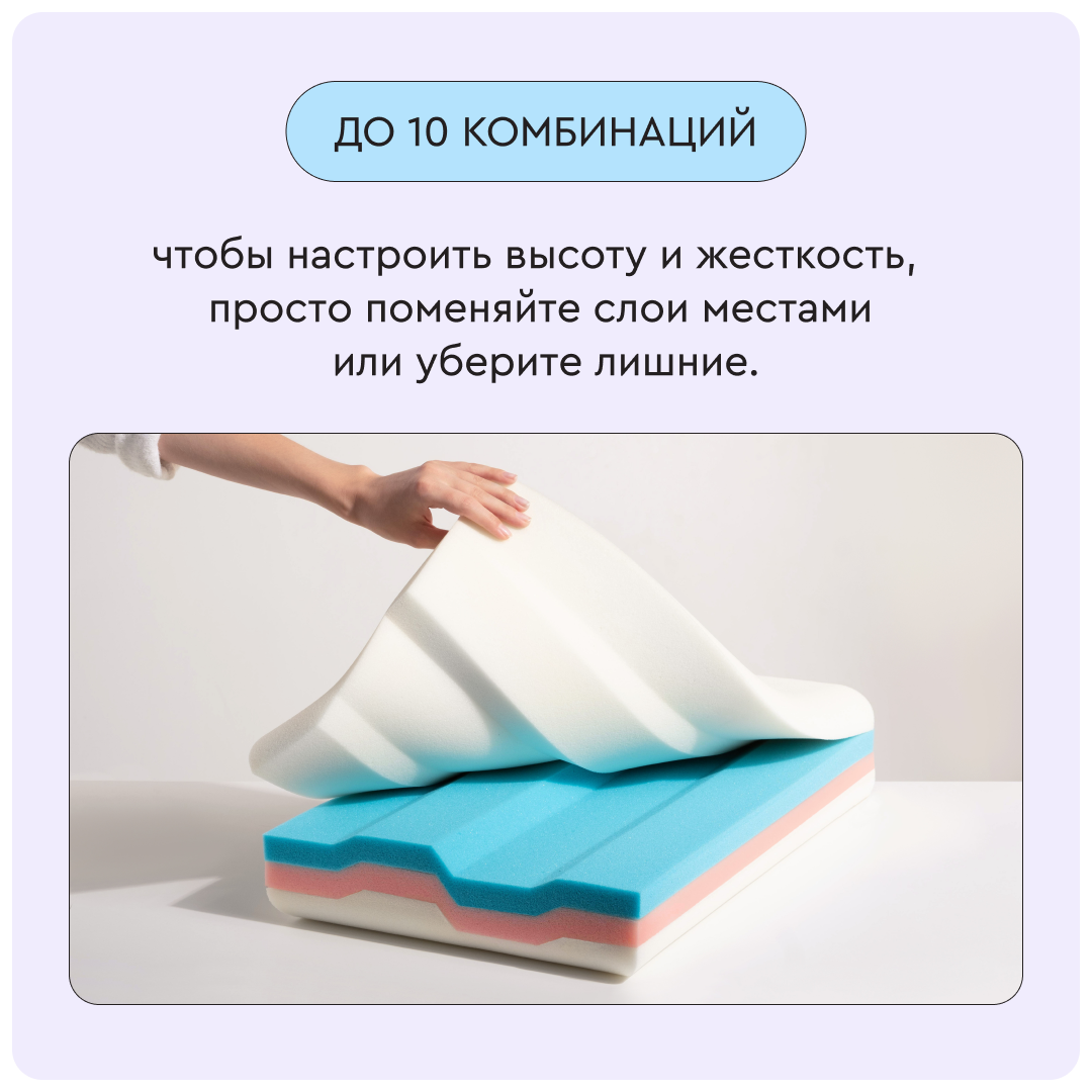 У подушки Somia Original есть 4 слоя разной плотности для персонального удобства и 10 комбинаций по высоте и мягкости. Меняйте слои местами, чтобы настроить подушку под любое телосложение и позу сна.
