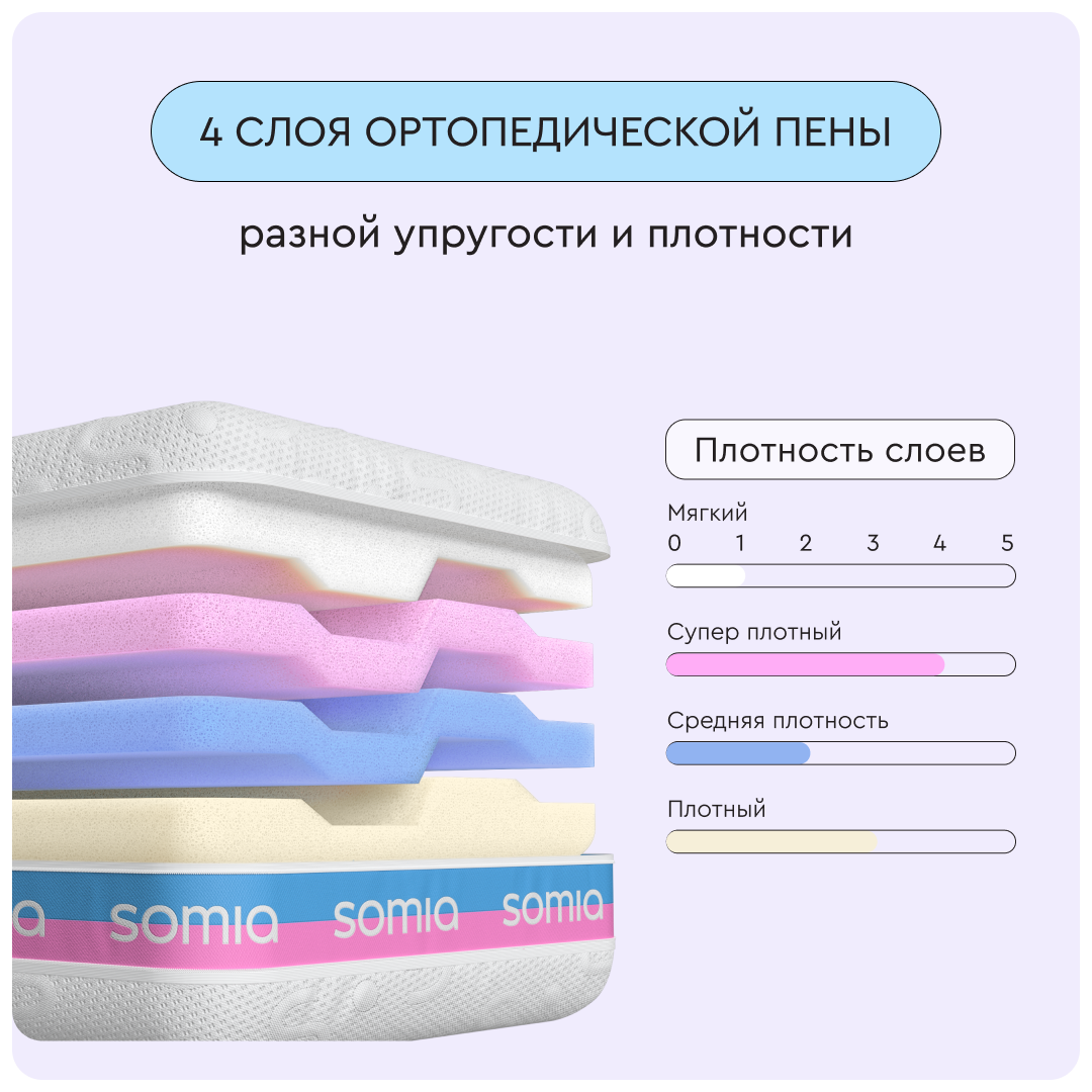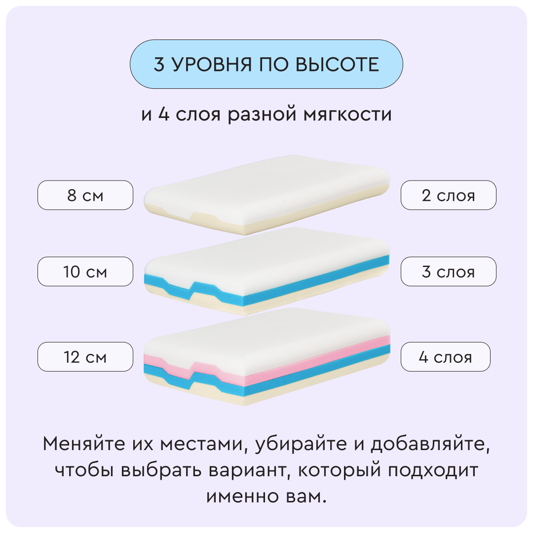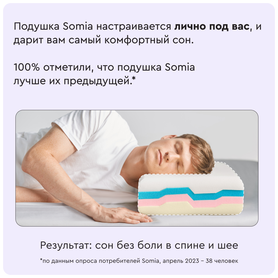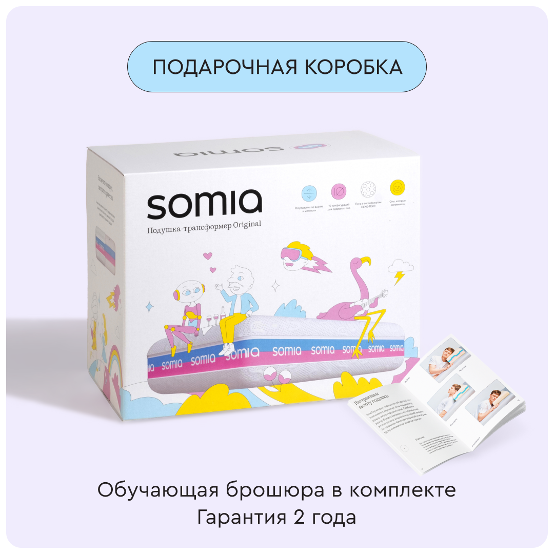 У подушки Somia Original есть 4 слоя разной плотности для персонального удобства и 10 комбинаций по высоте и мягкости. Меняйте слои местами, чтобы настроить подушку под любое телосложение и позу сна.